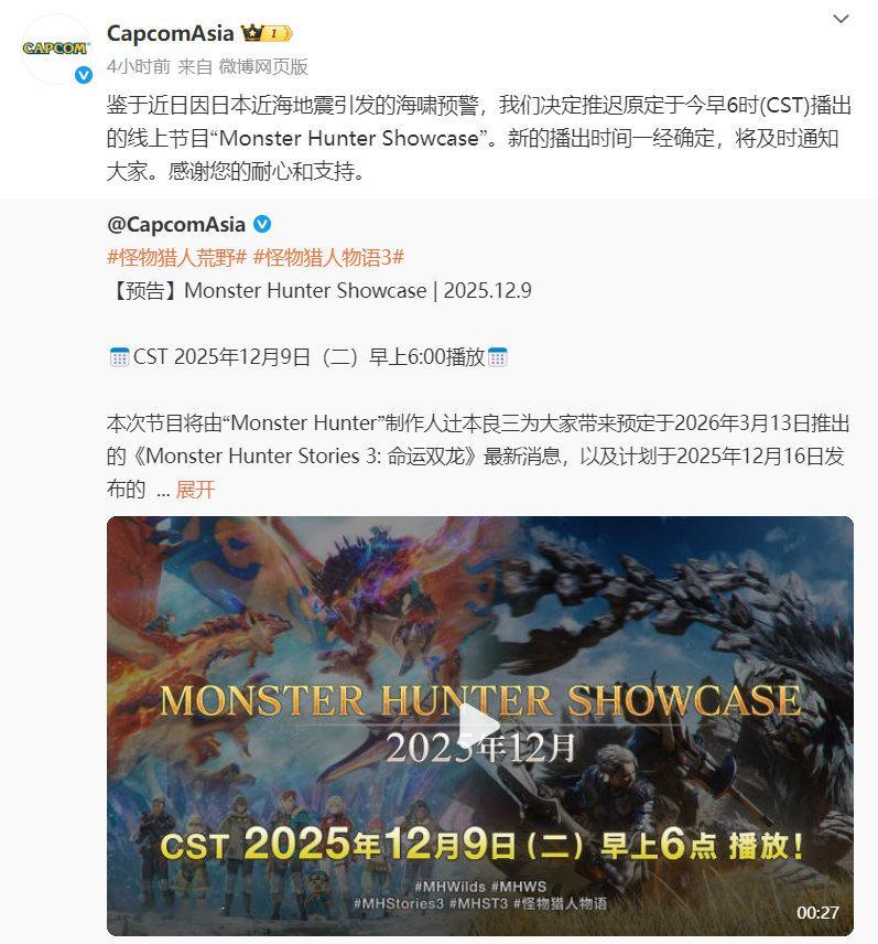 原定于今日举行的《怪物猎人》特别直播活动“Monster Hunter Showcase”由于日本地震引发的海啸预警确认延期,具体时间暂未公开。日本地震Steam