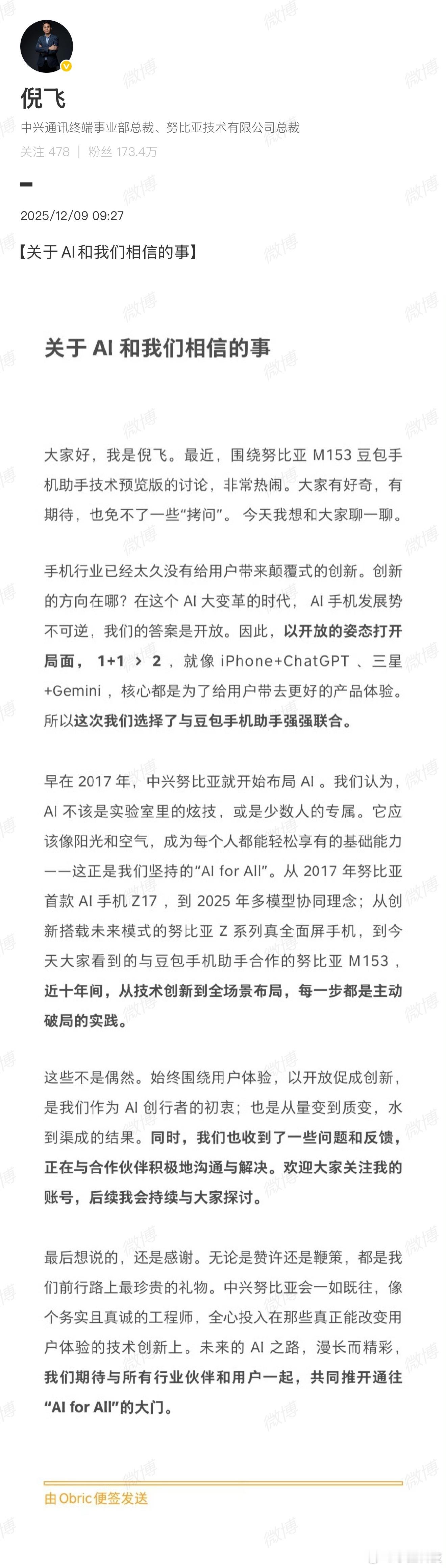 努比亚总裁倪飞回应豆包手机记得几年前很多人说AI是智能手机的下一个风口,目前来看,仍然是这样。AI大模型加持下,智能手机有了更多玩法和可能。但行业封闭明显,各家对类似“豆”也是围追堵截,这真的完全没有必要。就像国外有iphone与chatGPT、三星与Gemini携手合作,国产手机也应该积极寻找突破才对。现在努比亚M153努比豆手机,就是一次成功的尝试。围绕用户体验,以开放姿态促成创新,体现出努比亚一直以来“AI for All”的路子。作为创行者角色,努比亚在AI领域深耕已经有十年时间。1+1大于2,努比豆给用户带来更好体验是一回事,我感觉这等于是给行业提了个醒,合作才能共赢,智能手机需要AI,就没必要拒绝豆包。与其关上门自己搞研发,跟豆包合作也是一个很不错的方式。总之AI已经来了,看谁跑的快吧。