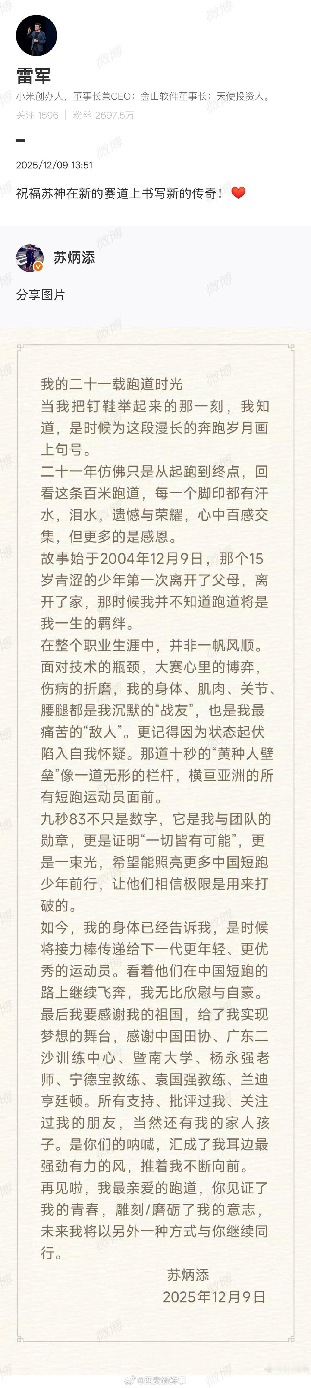 【雷军祝苏炳添在新赛道书写新传奇】12月9日,中国短跑名将、亚洲“飞人”宣布正式退役。苏炳添退役 下午,发文祝福苏炳添:祝福苏神在新的赛道上书写新的传奇!吴艳妮祝福苏炳添