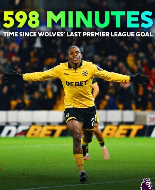 官方:狼队在对阵曼联比赛中的进球,是他们自十月以来的首粒英超进球,此前已经598分钟未能破门.....
