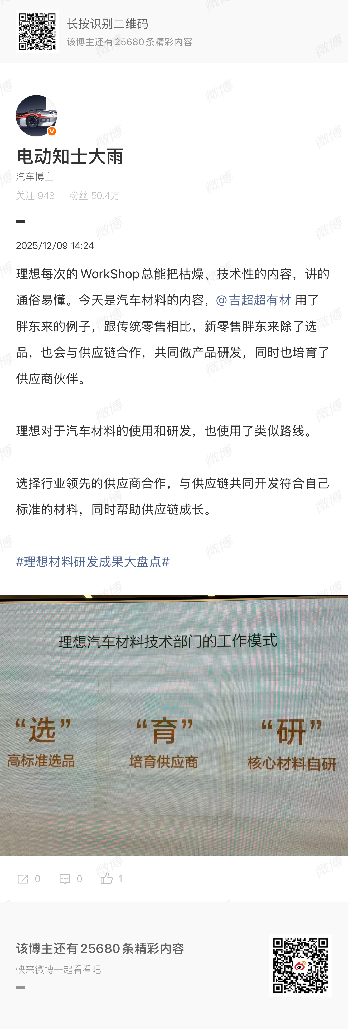 接上条,育和研的例子,以下来自kimi k2整理的内容:LeS6 Max是理想汽车与全球铝材制造商诺贝丽斯(Novelis)于2023年联合开发的超高强度6000系铝合金板。以下是该材料的核心信息:产品定位LeS6 Max是专为新能源汽车开发的第一款超高强度6000系铝板,目前已应用于理想MEGA车型地板加强件,主要用于提升碰撞安全性。性能特点• 高强度与良好成型性平衡:通过加工工艺控制优化烘烤响应速度,在服役状态下实现高强度与优异成型性的结合• 韧性优势:相比普通高强铝合金,在保持高强度的同时具有更好的延展性• 应用验证:已在理想MEGA车型上实现量产应用后续升级版本2025年3月,双方发布了升级版LeS6 Ultra,性能进一步提升:• 屈服强度接近传统铝合金的3倍,比LeS6 Max再提升30%• 三点弯曲测试中,最大力和吸能量分别提升33%和31%• 80焦耳冲击下穿刺侵入量减少30%• 240小时盐雾试验中抗腐蚀性优于常规材料合作背景该材料是理想汽车与诺贝丽斯深度合作的成果,标志着国产汽车品牌在先进材料领域的突破。双方已成立联合实验室,持续推动更轻量、更强韧的铝合金材料研发。 理想材料研发成果大盘点