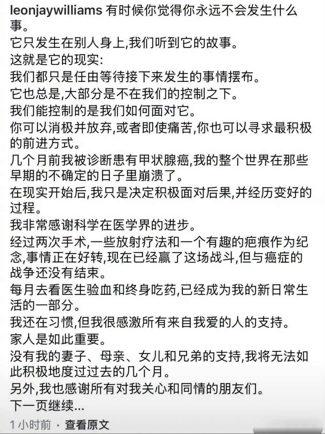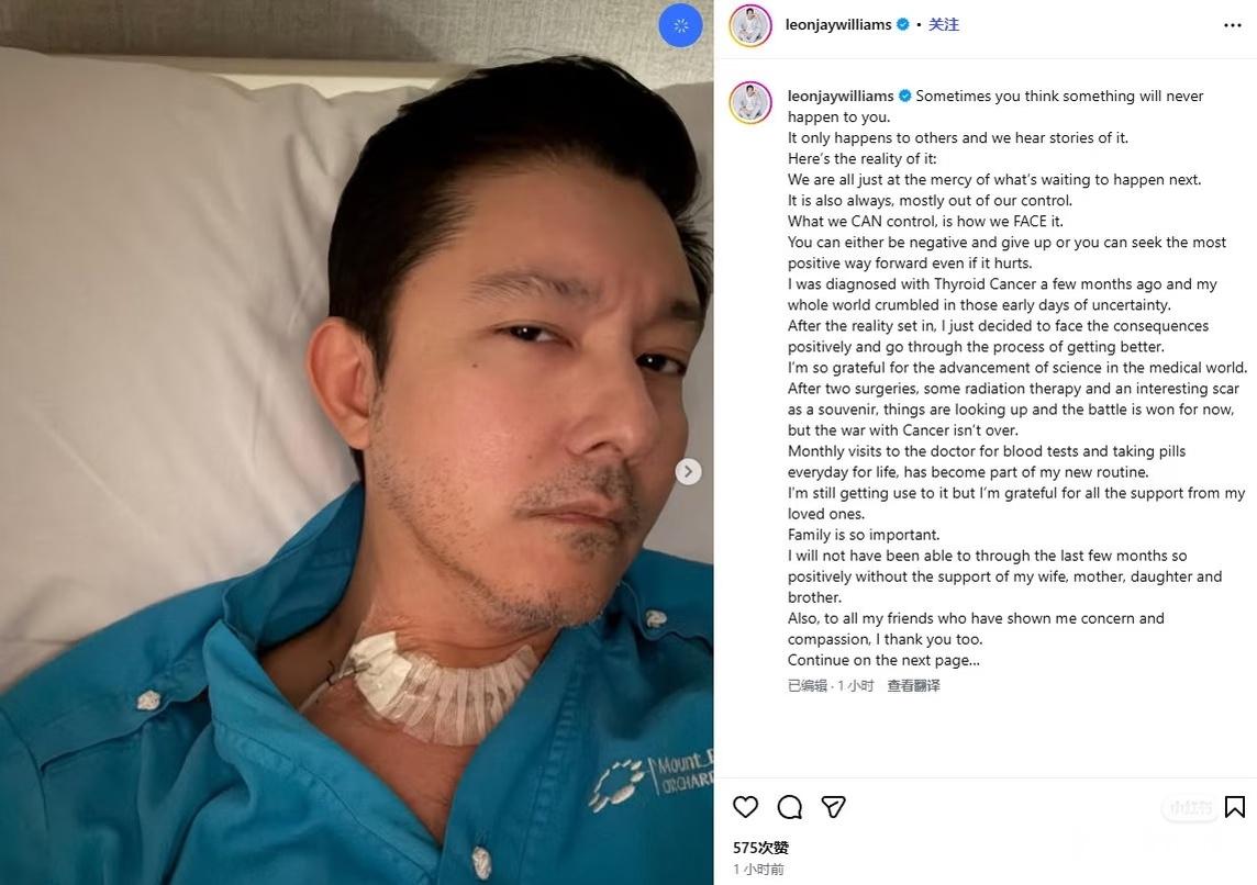 立威廉被曝患癌后发文知名男演员确诊癌症,已进行两次手术🔝 近日,曾主演《天国的嫁衣》《绿光森林》《放羊的星星》等偶像剧的男演员立威廉,在接受采访时透露自己今年确诊了甲状腺癌二期。👉 立威廉称,看到检查报告和医师判定结果,他感觉眼前一黑“天要塌了”,满脑子悲观地想着:“能不能看到我女儿长大?”👉 据悉,立威廉在9月进行了两次手术,分别取出了3厘米、1.1厘米的两个肿瘤。他称:“目前应该说99%已切除肿瘤,但就怕扩散,肺部已照出有结节,所以后续还要追踪、治疗,每个月都要吃药控制。”因为担心放射治疗有辐射,害怕影响家人,立威廉还刻意搬到名下空房独居。面对需要一辈子追踪的病情,立威廉态度很乐观:“该接受治疗的就治疗,平常该做什么还是做什么,人生嘛,不就是如此。”立威廉晒术后照