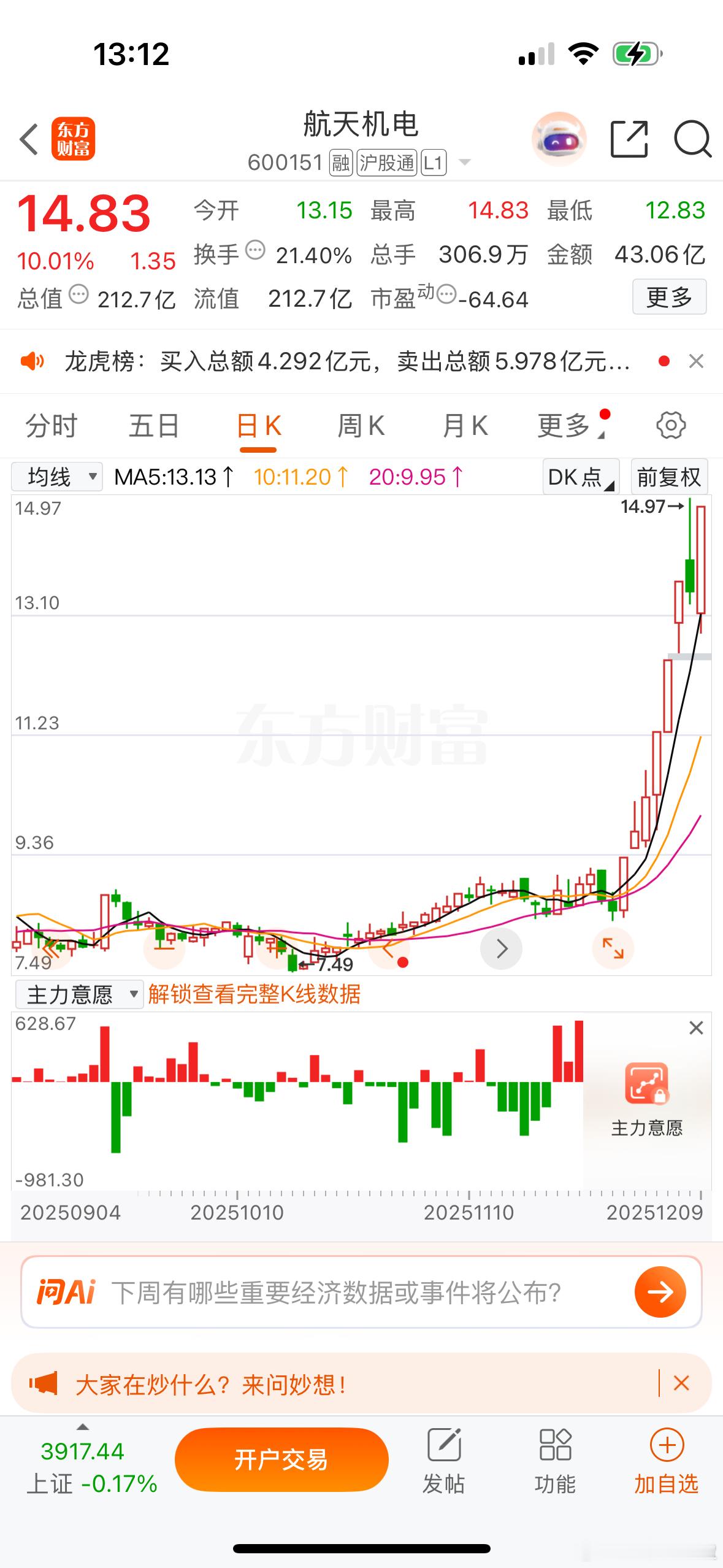 上午弱分歧,最强的还是福建,而航天这边上午走的是轮动,昨天弱的今天强,昨天强的今天弱搞的全是预期差。航天这么走的话弹性抱团一直不知道聚焦谁了,航天发展这个中军抱团明牌今天是比较稳定,目前缺的是一个能主动进监管的了,有机会进监管的暂时还是航天机电,顺灏股份,飞沃科技,其他都距离更远,看看谁能第一个进监管,也是明后天的事了。