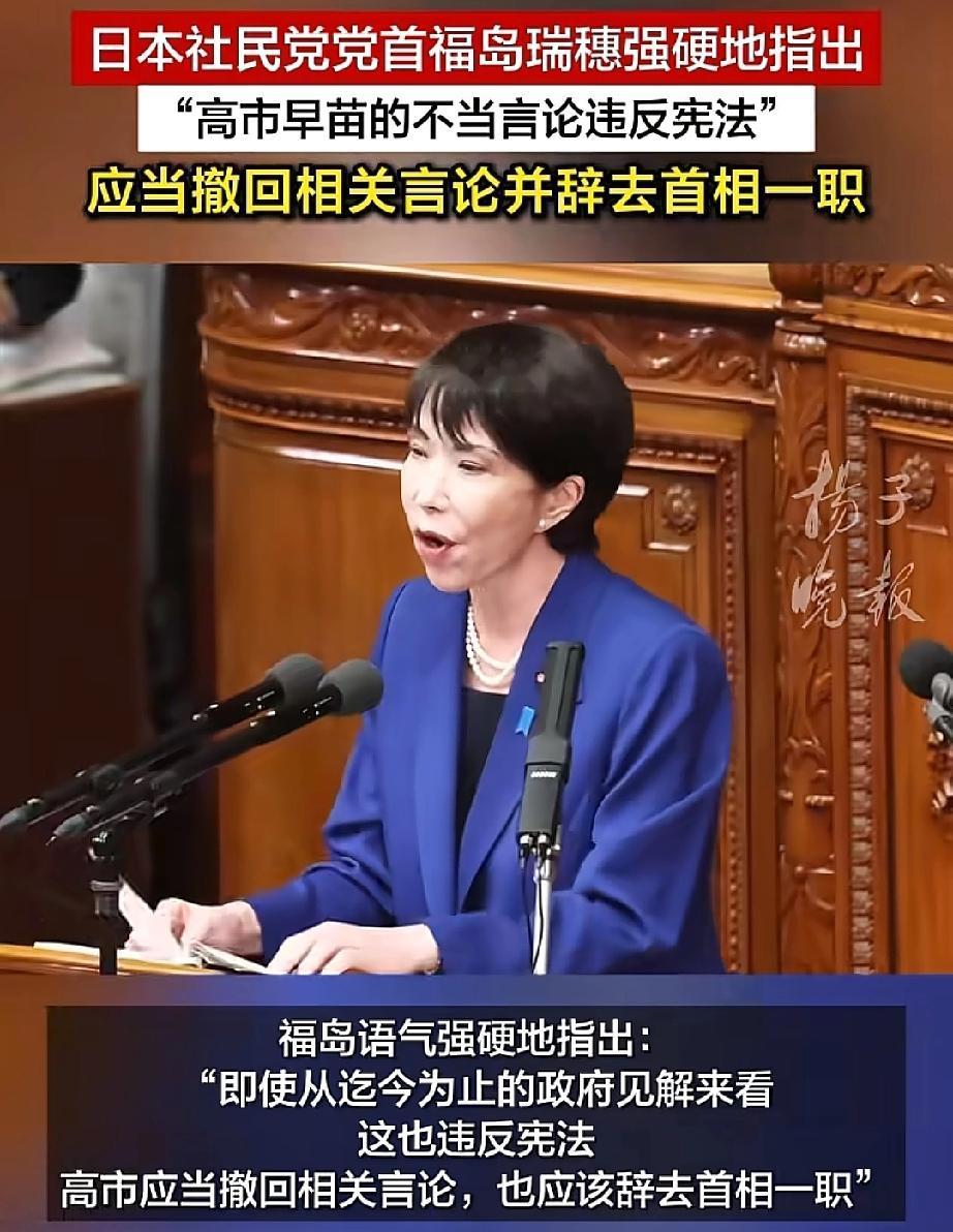日本政坛闹翻天! 首相高市早苗被社民党发难,就因为这句涉台言论? “台湾有事就是日本有事?”日本社民党党首福岛瑞穗在演讲上直接开炮,指责首相高市早苗的说法违宪,现场70多名支持者的掌声几乎要掀翻屋顶。这场在福岛县办的交流会,转眼就成了公开批评现任内阁的“战场”。 原来高市早苗之前把“台湾有事”和“国家存亡危机”绑在一起说,在日本国内掀起了不小的波澜。社民党干事长吉川元直接撂下狠话:“必须把这话收回去,还得辞职!”更有意思的是,福岛瑞穗年初刚去动物园看了熊猫,在抗战纪念馆献花时还特意写下“以史为鉴珍爱和平”。 冲绳反战团体早就发出过警告,说日本现在正变成军事堡垒。现在连九州和西日本的普通老百姓都开始心里犯嘀咕:高市早苗这么强硬的态度,会把国家带向啥方向?社民党作为维护宪法的“老先锋”,这次能把首相拉下马吗?这场风波会让日本政坛变天吗?