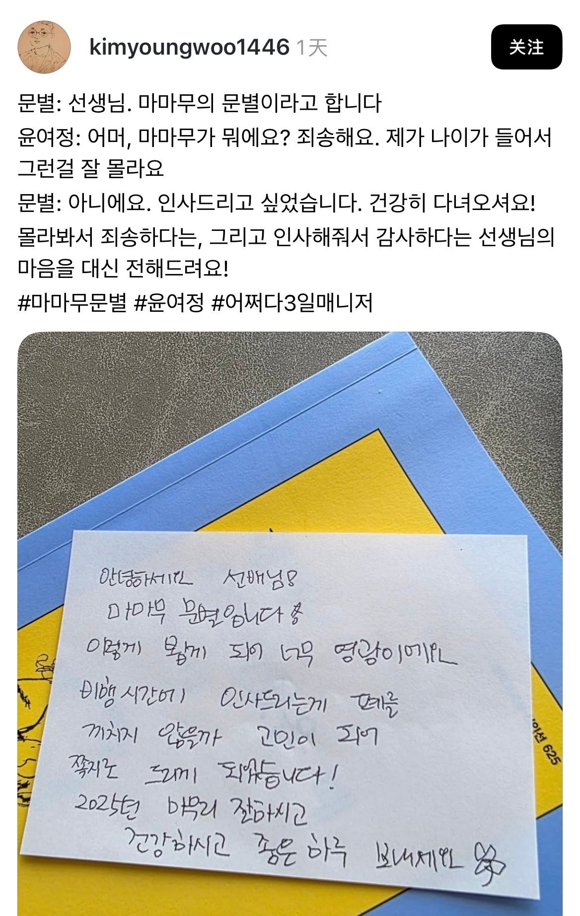 文星伊美谈+1 ,在飞机上偶遇影坛前辈老师主动过去问好,因为害怕打扰所以临时写了手写信问候前辈,被前辈的经纪人认证po文夸赞
