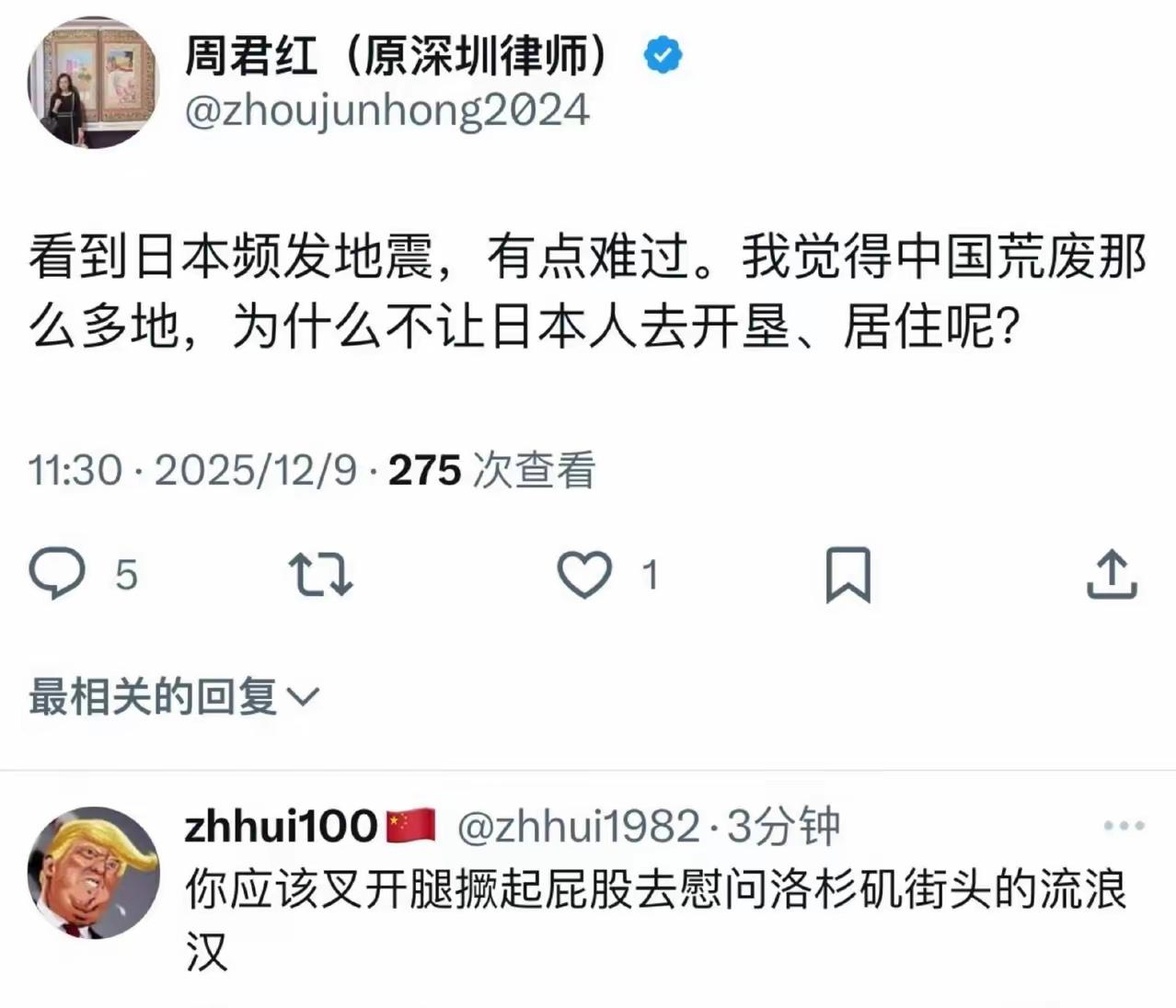 不得不说她一路走来变成如今这境遇,完全是咎由自取了。 她这般“悲天悯人”的情怀,虚伪到让人心生厌恶。 中国的荒地,于她而言,不过是随意抛售的“无主货物”,中国的土地一寸都浸满了先烈的鲜血,她哪来的勇气轻轻松松就一句“让日本人去开垦居住”。可曾见那荒地里长出的稻穗,是先人汗珠浸出来的根脉?可曾听过那土地下的故事,是无数血脉扎下的魂? 这般虚情假意的“仁爱”,恰似那墙头的芦苇,头重脚轻根底浅;又像那庙里的菩萨,外表慈悲,心里却装着陌生人的账本。到底是“悲”到了别人的瓦砾,忘了自家的屋檐;“悯”错了土地,丢了自己的根。 这样的“圣母”,只能感动自己,恶心别人罢了。 你们说她如今的境遇是不是咎由自取呢?