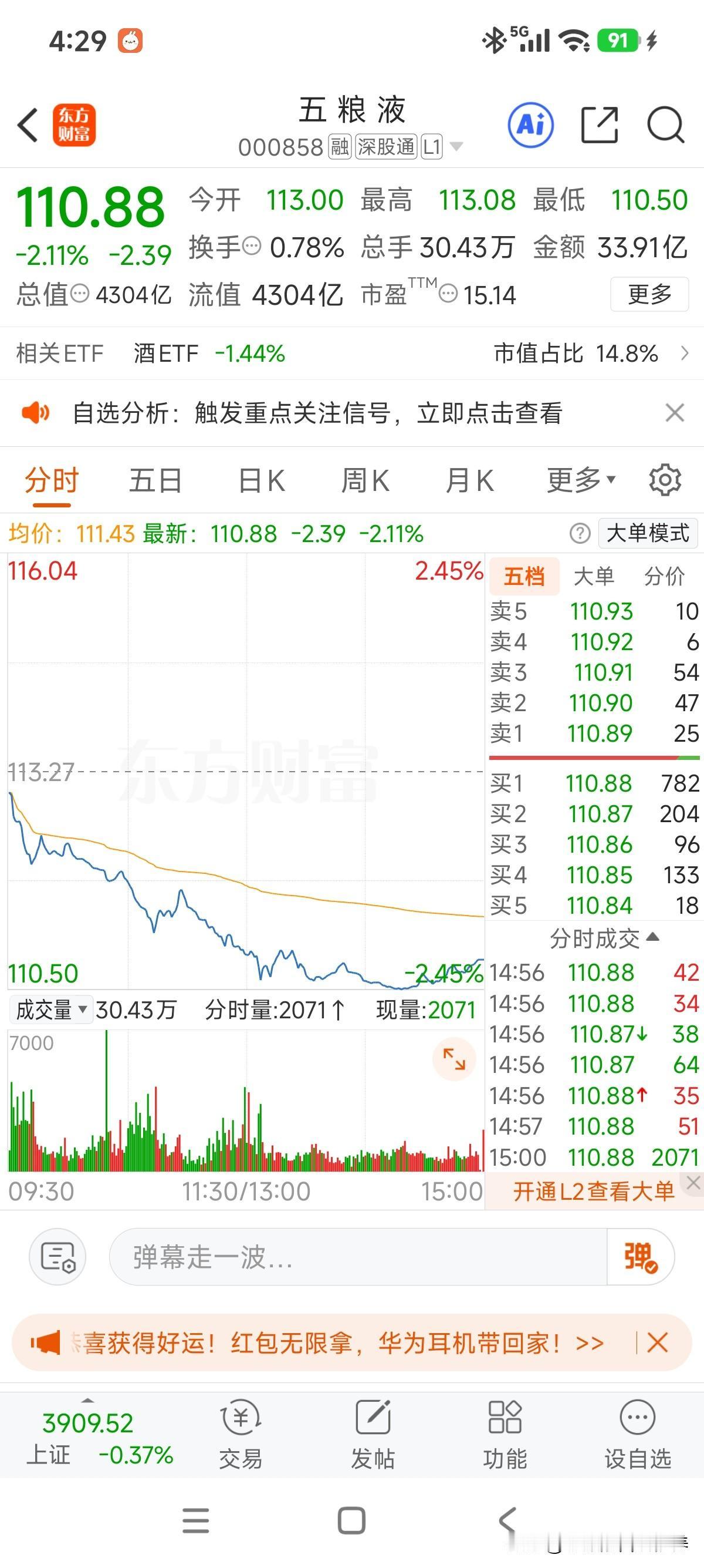 再创新底[捂脸],十三个交易日收了12根阴线!搞得好像要被ST一样! 消息面上无非就是降价!降的是酒价,跌的是股价!还得除权100亿,除权后市值只剩4200亿了!账面仍有1400亿资金,继续等待管理层研究回购注销事宜! 个人目前五粮液持仓不算多,短期不操作了,分红后如果继续在110以下位置再复投!