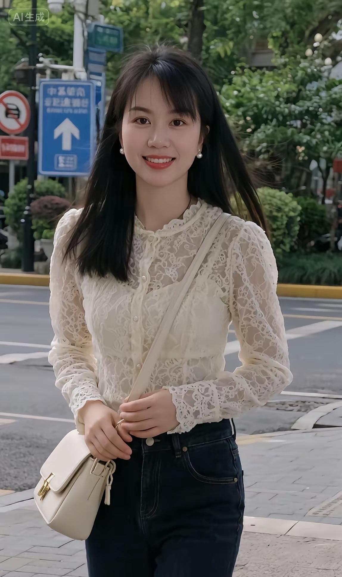 优雅蕾丝白衬衫,搭配牛仔裤,简约时尚,街拍必备!