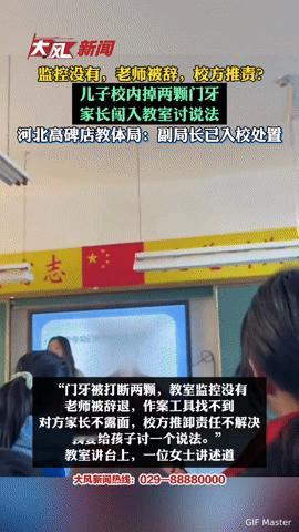 孩子校内掉两颗门牙,家长讨说法:监控没了,老师被辞,校方还推责 河北高碑店有位家长最近犯了难:孩子在学校被打掉两颗门牙,可教室监控没了,涉事老师也被辞退了,连打人的伞都找不到,对方家长不出面,学校还一个劲推责任。 这位家长着急了,直接闯进教室讨说法,“我孩子没法正常上课,打人的却还在上课!我自己花钱给孩子治病,就想要个说法!” 现在当地教体局副局长已经去学校处理了,大家都在等结果,想知道这到底是学生打闹意外,还是校园欺凌。 孩子牙齿受伤,家长心里也难受,就盼着能赶紧有个公正的交代。
