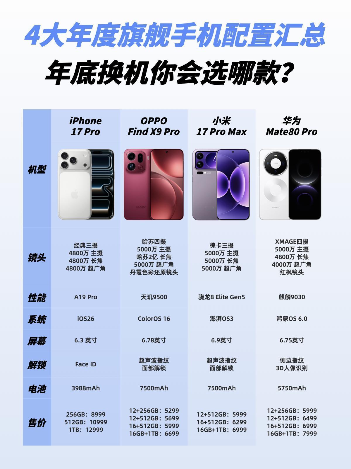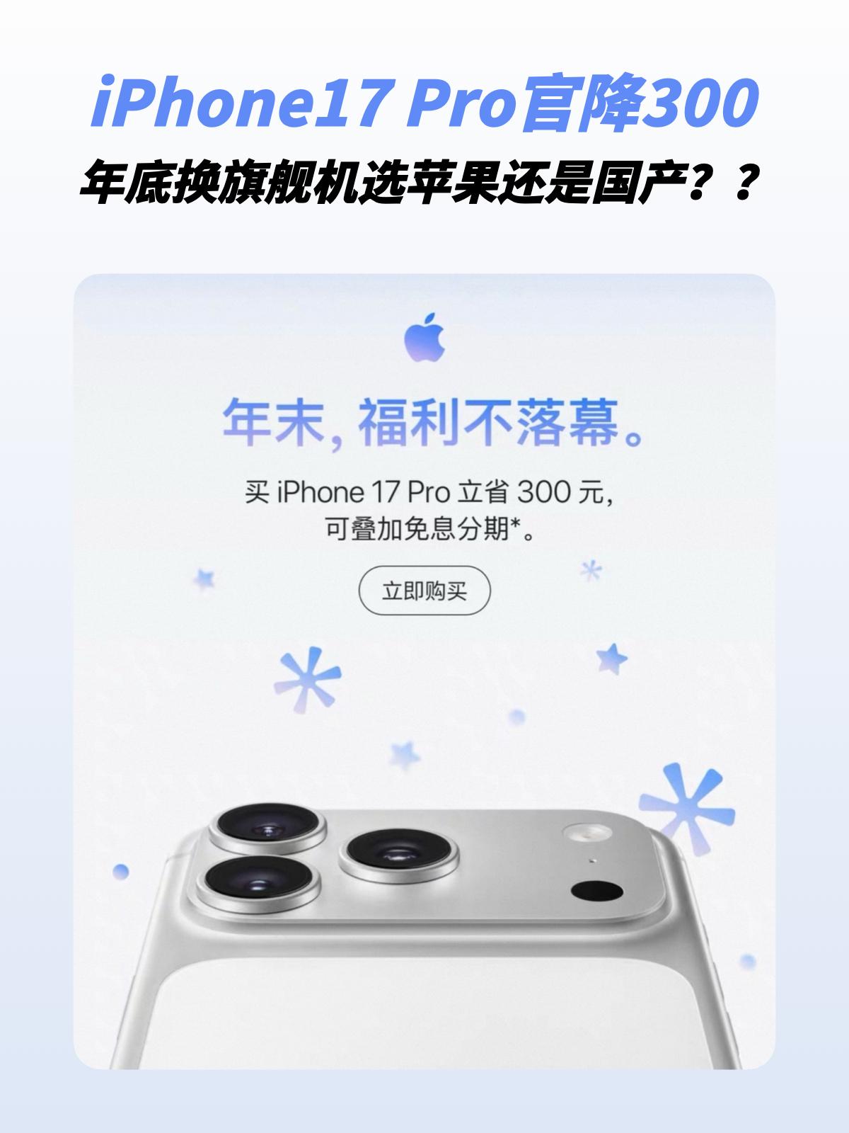 破天荒!iPhone17Pro官降,选它还是国产? 果子年底了也降价啊,iPhone 17 Pro系列两款都降了300,虽说不少人吐槽这降的太少了,但这可是苹果官降啊,很少见哦!😂双12打算换新iPhone的果粉舒服了,果然是晚买有折扣 不过今年还真是换手机的好时机,新旗舰都巨强,四大年度旗舰除了iPhone 17 Pro之外,华为Mate80 Pro、小米17 Pro Max和OPPO Find X9 Pro都很有说法的! 华为Mate80 Pro星环设计辨识度拉满,质感这一块是够权威的。影像能力还有大提升,第二代红枫镜头确保色彩真实,四摄拍啥都很出片,5999起还比iPhone17 Pro亲民不少 小米17 Pro Max也是大屏旗舰,徕卡三摄影调风格依旧对味,骁龙旗舰芯片也有保障,电池、屏幕这些配置也全都没拉下,而且还有个很新颖的背屏设计,5999人气不错 OPPO Find X9 Pro整体很全面,跟华为一样有色彩镜头,新一代的丹霞色彩还原镜头、2亿哈苏潜望、大底主摄等哈苏四摄,随手拍就是大片。主要是日常用还很舒服,ColorOS 16是丝滑出名了的,还有各种AI实用功能,配上7500mAh电池,出门玩基本告别充电宝,5299性价比很到位 果粉离不开iOS生态,体验求稳那趁着降价入iPhone 17 Pro当然没毛病,其它人按照自己需求从这几款年度旗舰里选也很香嘛。如果是你的话,你会选哪款呢?