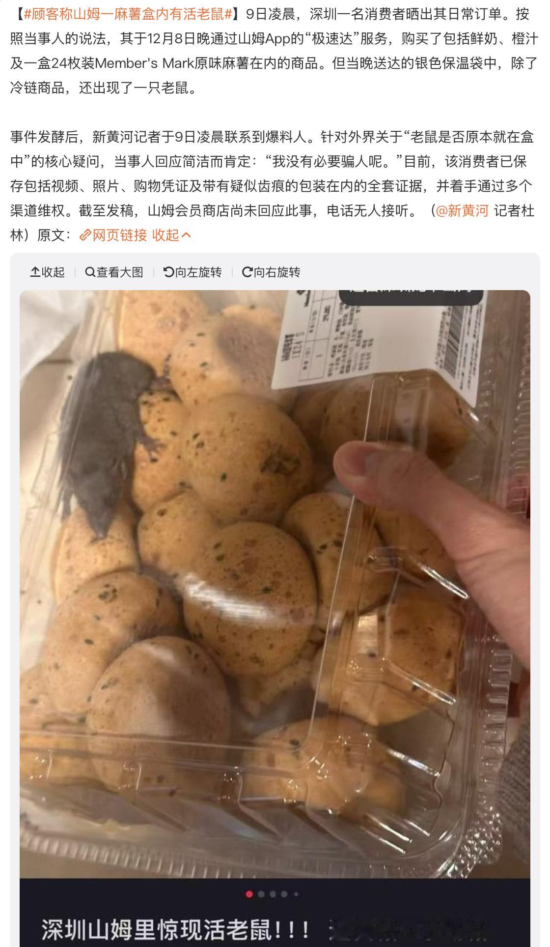 山姆的状况又来了啊?深圳一山姆麻薯盒出现活老鼠 。记得好像麻薯后来都是有塑封包装的,这么大一只,不应该是打包的时候进去的吧。如果是运输过程进去的,塑封应该也就咬破了。这个看起来,略显夸张了这个大小。不过话说回来,山姆现在的体验真的越来越差。这么下去,迟早玩完。反正这个会员到期不续了,自己玩去吧。