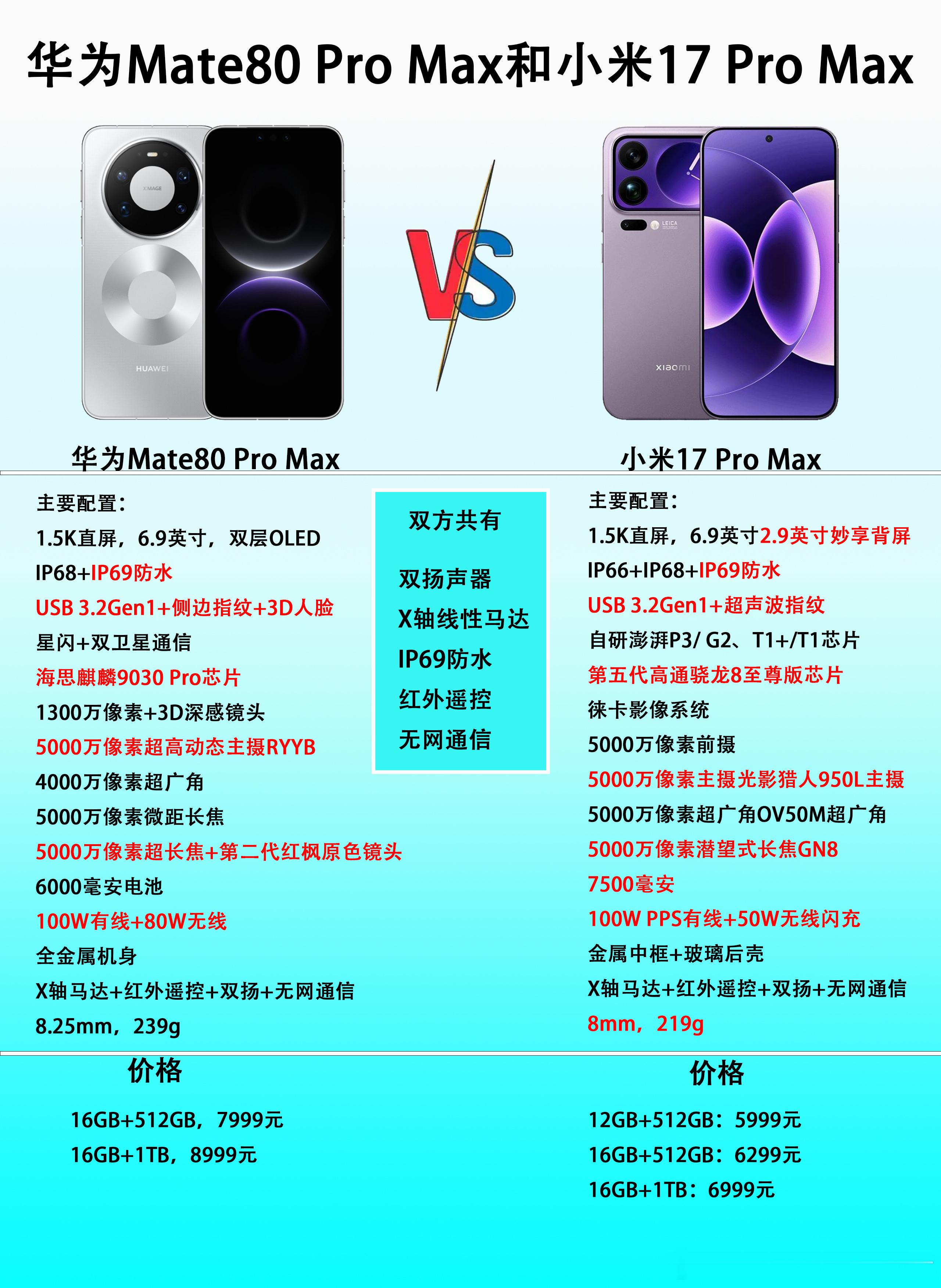 国产高端手机的碰撞,华为Mate80 Pro Max和小米17 Pro Max怎么选?今年小米和华为都把自己的旗舰手机换名了,作为国产品牌中流量扛把子,自然会避免不了产品的对比和竞争。华为Mate80 Pro Max这一代产品配置和价格都挺不错。麒麟9030 Pro芯片性能比上一代提升了不少,屏幕也给了双层OLED技术;影像系统基本拉满了,超高动态主摄加上两颗潜望式长焦,硬件上毫无保留,该给的都给了。而且,它还是全金属机身设计,挺难得的。小米17 Pro Max其实主打的个性化旗舰手机,它的可玩性相当高。主要是增加了一块2.9英寸的背屏,实用性还不错。同时,它的第五代高通骁龙8至尊版芯片性能更强,影像系统也该给的都给了,配置上也没短板。价格方面,华为Mate80 Pro Max起步价7999元;小米17 Pro Max起步价5999元。价格也会有些差距,小米的性价比和娱乐属性更高,在乎价格和性能选择小米;华为的商务属性更高,适合商务办公人士或者追求品牌力的话选择华为,整体上看都挺不错的。