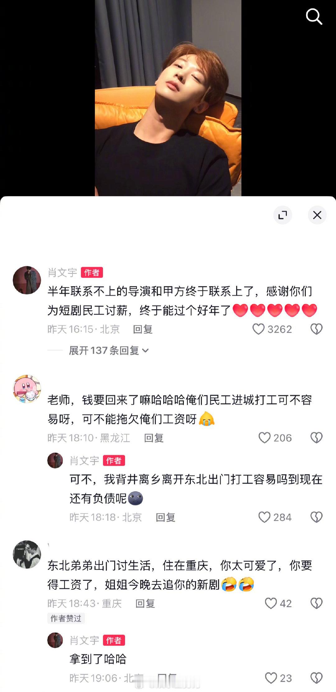短剧男主被欠薪半年在线讨薪短剧男主剧播后都没拿到工资 近日,短剧演员在社交平台自曝已被拖欠片酬长达半年,直到近期才联系上导演和甲方讨回薪资。12月8日,肖文宇在动态中透露,“半年联系不上的导演和甲方终于有了消息”,感谢网友关注让自己“能过个好年”,还调侃自己是“背井离乡的短剧民工”,甚至因欠薪陷入负债。