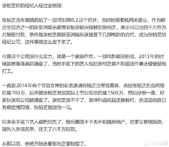 张柏芝和前经纪人经过全梳理 概括来说就是一个做阴阳合同,两头骗的经纪人,倒打一耙把别人告上了法庭的故事。值得一提的是,张柏芝发现余冒名签约的时候,顾念旧情没有追责,余为了捞点好处却对张柏芝企图赶尽杀绝,之前写歌辱骂,现在还通过舆论想给张柏芝塑造疯女人形象。。