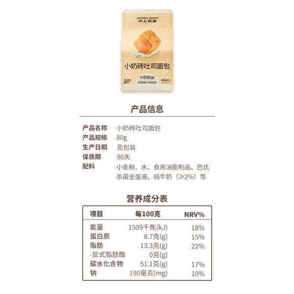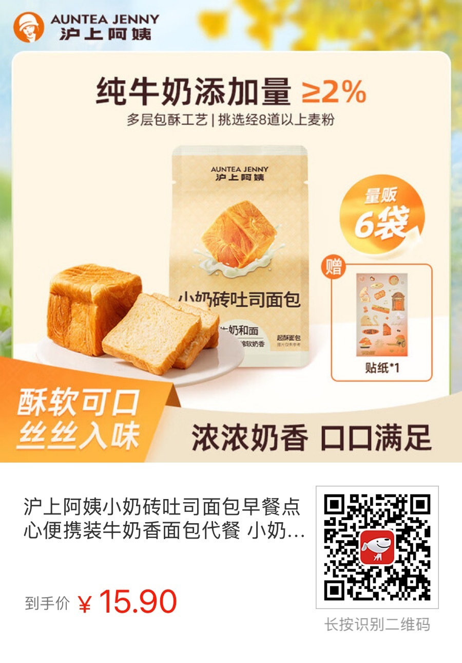 【JD到手价15.9】🍞 早餐新选择,沪上阿姨小奶砖吐司面包,80g*6袋便携装,牛奶香浓郁,口感松软,随时随地享受美味早餐,营养又健康!