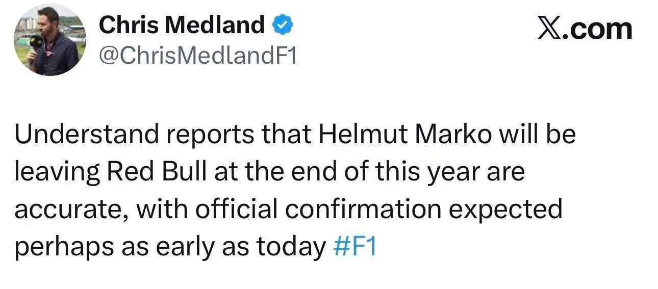 据ChrisMedland,马尔科年底离开红牛的报道属实,预计最快今日官宣F1