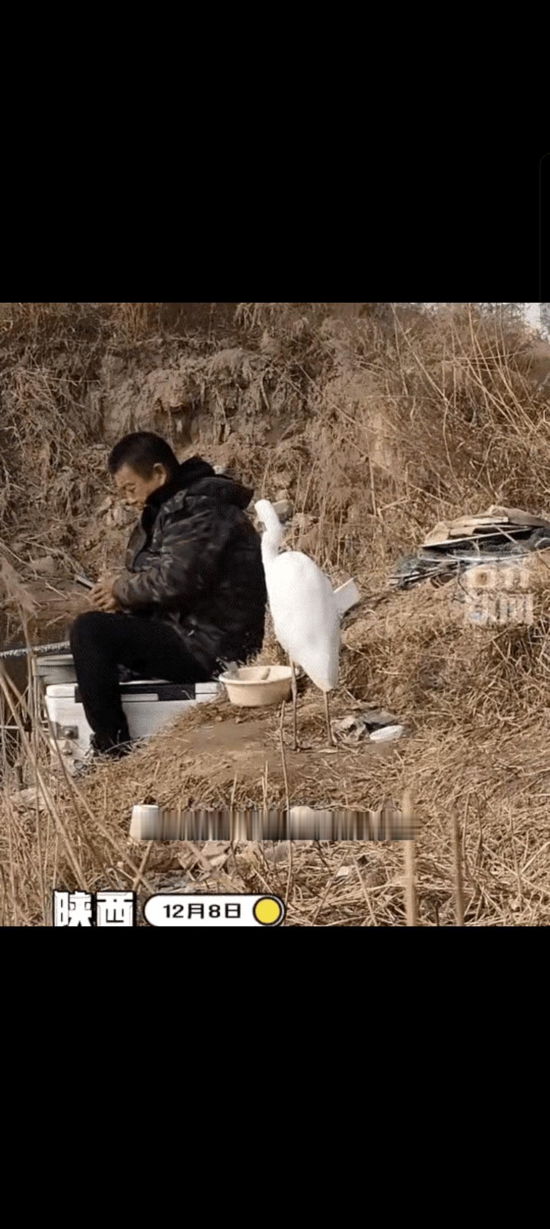 太和谐了!陕西,一男子在河边钓鱼时,竟看到旁边一位钓友,和一只野生白鹭和谐相处的