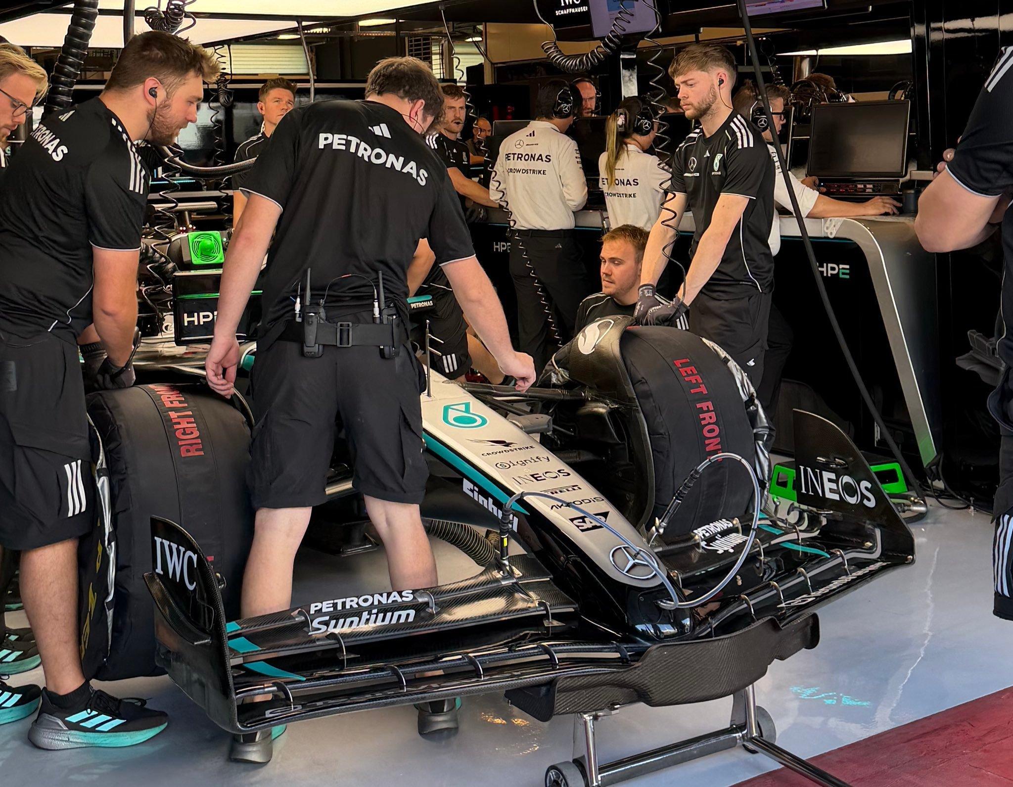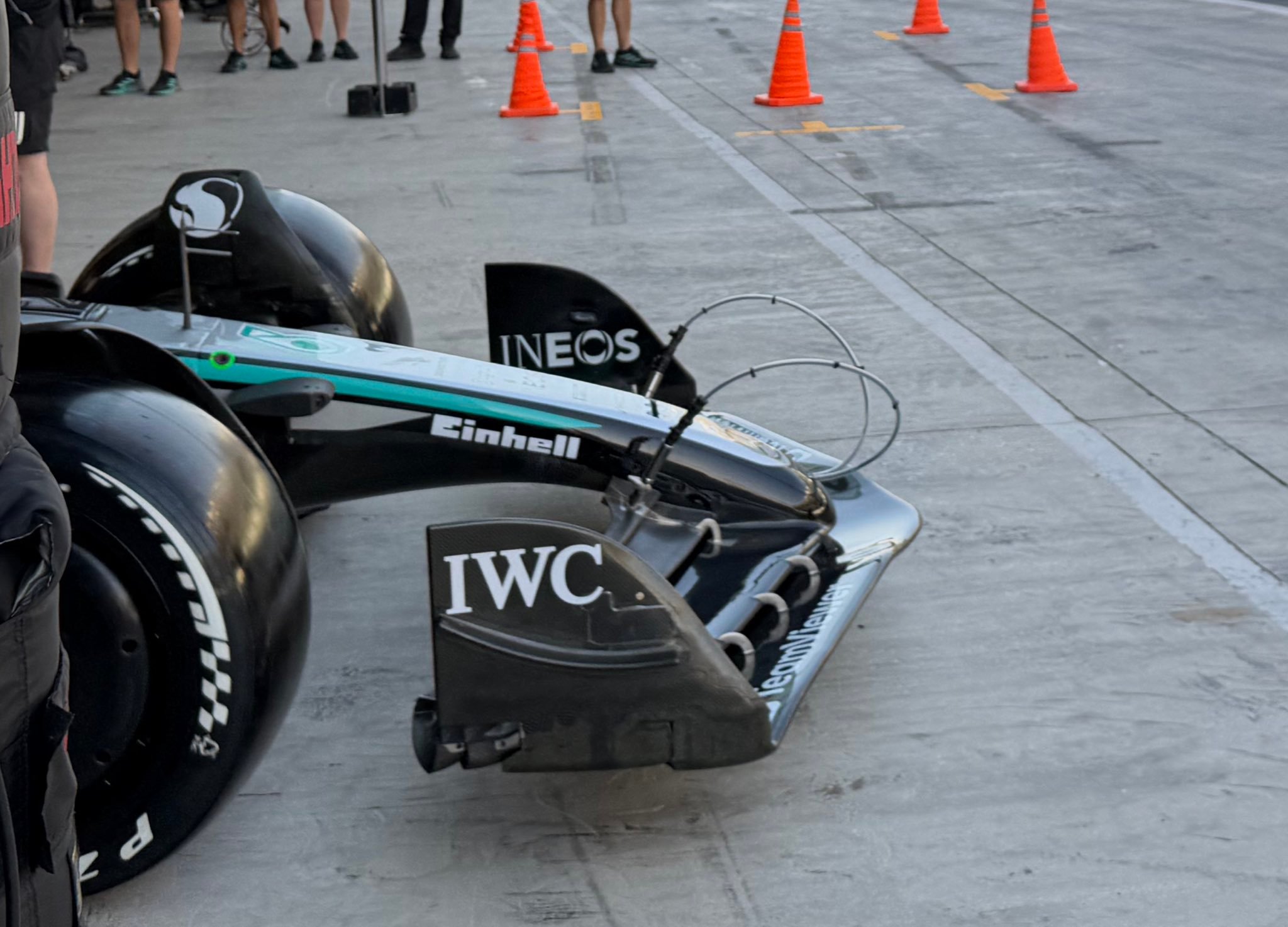 梅赛德斯车队在今天的F1季后测试中使用明年的倍耐力轮胎并进行了2026年主动式空气动力学前鼻翼的效果模拟(由安东内利驾驶)F1赛车F1阿布扎比季后测试