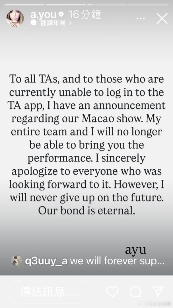 濱崎步宣布取消明年1月澳門演唱會 發聲明表心痛.日本天后濱崎步上月尾因不可抗力原因取消上海演唱會後,原定下月10日在澳門舉行的亞洲巡迴演唱會尾場,今日(9日)亦宣布取消。步姐在社交網公開日文及英文聲明,表示所屬avex唱片公司與主辦商議後,她表示心痛,並遺憾未能令巡唱劃上完滿句號。她又感謝粉絲支持,並計劃讓持有上海及澳門站門票的粉絲,優先購買明年巡唱門票。