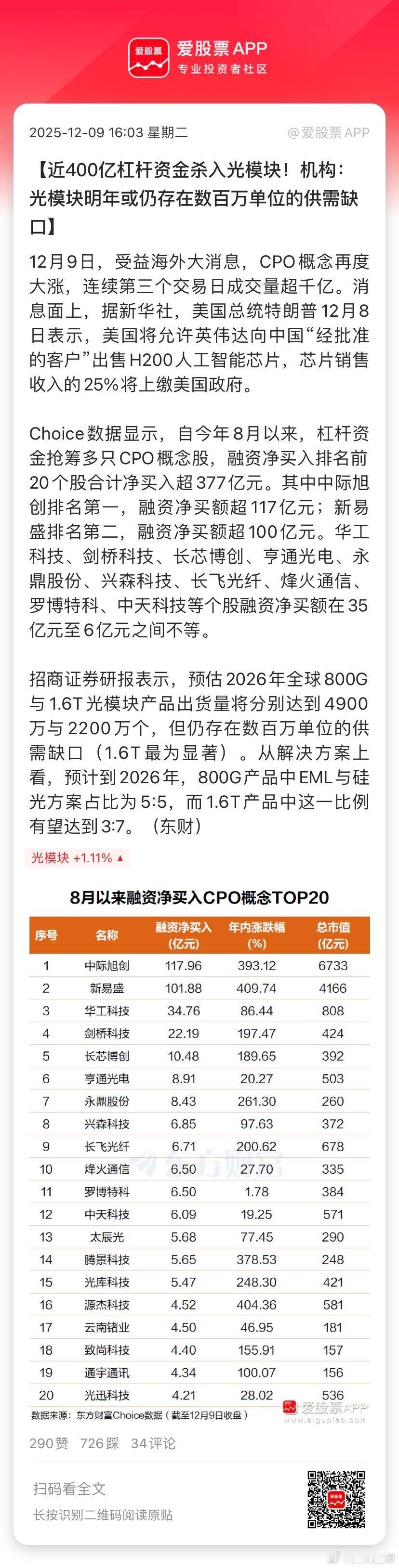 【近400亿杠杆资金杀入光模块!机构:光模块明年或仍存在数百万单位的供需缺口】12月9日,受益海外大消息,CPO概念再度大涨,连续第三个交易日成交量超千亿。消息面上,据新华社,美国总统特朗普12月8日表示,美国将允许英伟达向中国“经批准的客户”出售H200人工智能芯片,芯片销售收入的25%将上缴美国政府。 Choice数据显示,自今年8月以来,杠杆资金抢筹多只CPO概念... 网页链接