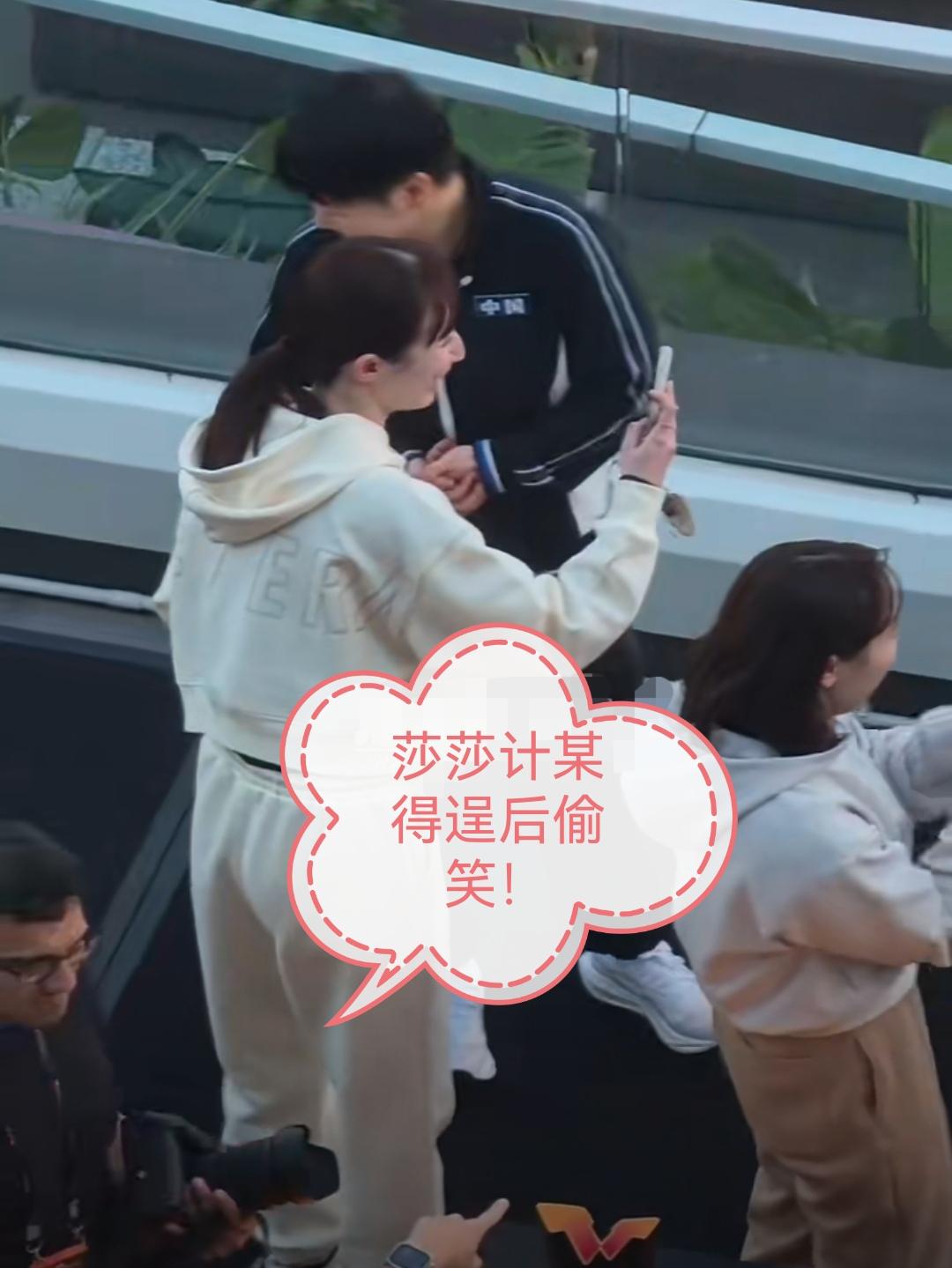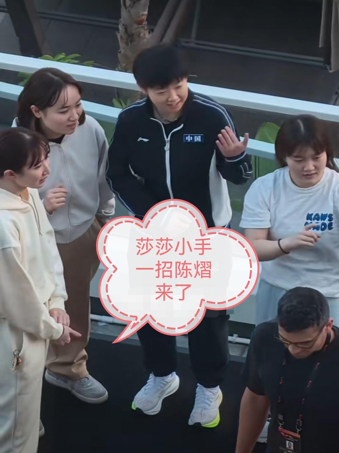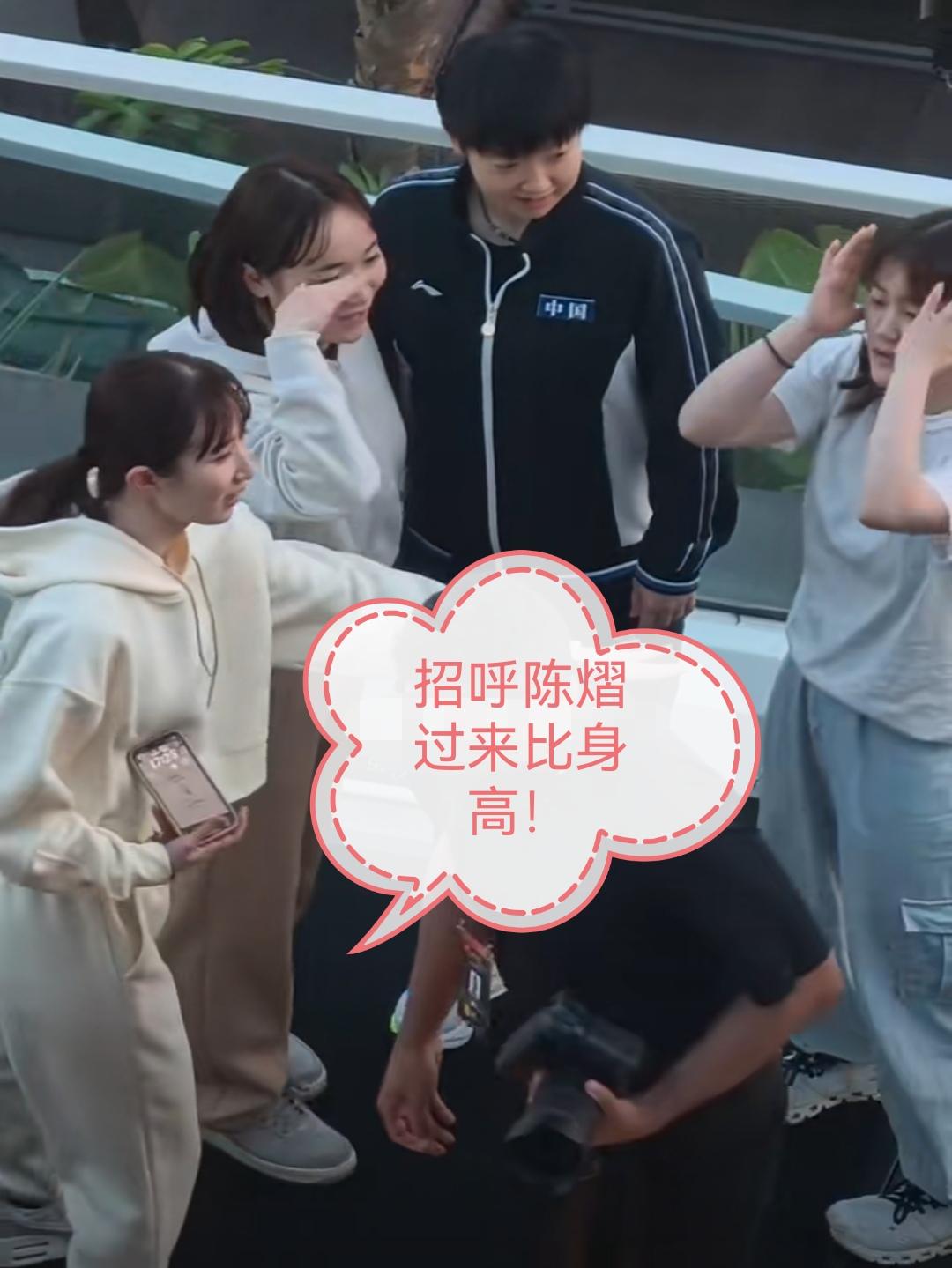 原来大藤沙月和陈熠量身高这件事,是莎莎和伊藤美诚共同策划的结果,刚开始伊藤美诚、早田希娜和大藤沙月三名日本女队员围着莎莎在聊身高。 聊着聊着就看到了陈熠,陈熠是这一次香港总决赛参赛队员身高最高的,大藤沙月是身高最矮的,几位小姑娘就想看看大藤沙月和陈熠站在一起的效果,于是莎莎对着陈熠小手一招,示意陈熠过来,伊藤美诚还对着陈熠不停地比划。 陈熠走过来了,大藤沙月迎了上去,莎莎觉得她俩站在一起太搞笑了,莎莎怕自己憋不住,侧过身体偷笑,这群小姑在赛场下真的很可爱,八百个心眼子的莎莎,当她的小诡计得逞了,就想偷偷笑一会。