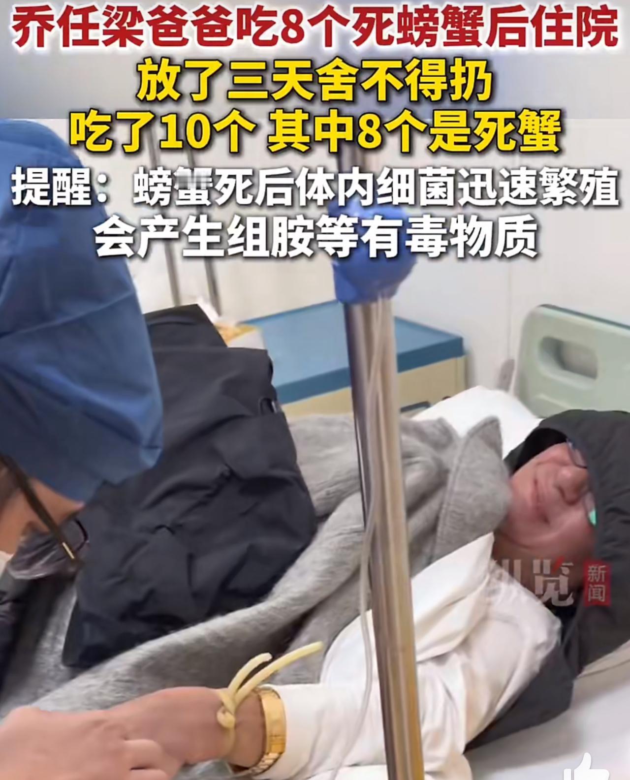 乔任梁爸爸因吃8个死蟹住院。 太可怕了。 这个绝对可以警醒到大家。 近日乔任梁父亲因为不舍得扔掉存放3天的大闸蟹,他竟然把死螃蟹吃了而中毒入院。要知道螃蟹身上细菌🦠极多,就是活的也要蒸很久,死的就更脏了! 千万不能大意。