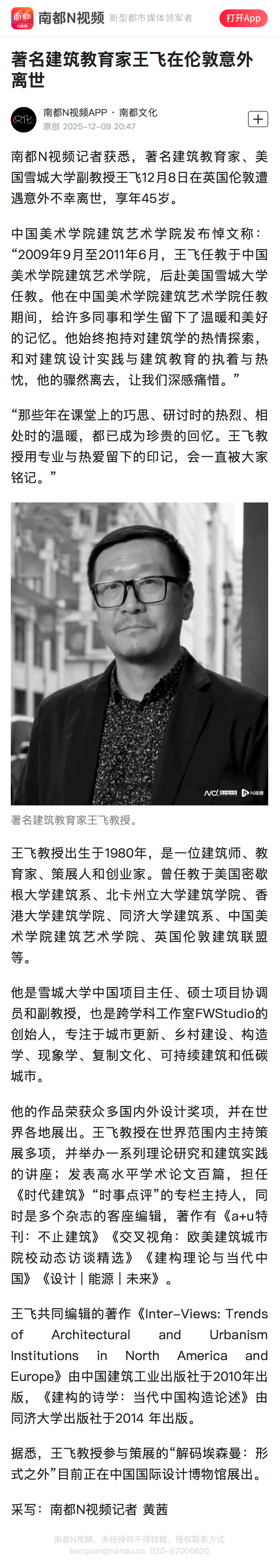 【#著名建筑教育家王飞在伦敦意外离世#】南都N视频记者获悉,著名建筑教育家、美国雪城大学副教授王飞12月8日在英国伦敦遭遇意外不幸离世,终年45岁。中国美术学院建筑艺术学院发布悼文称:“2009年9月至2011年6月,王飞任教于中国美术学院建筑艺术学院,后赴美国雪城大学任教。他在中国美术学院建筑艺术学院任教期间,给许多同事和学生留下了温暖和美好的记忆。他始终抱持对建筑学的热情探索,和对建筑设计实践与建筑教育的执着与热忱,他的骤然离去,让我们深感痛惜。”“那些年在课堂上的巧思、研讨时的热烈、相处时的温暖,都已成为珍贵的回忆。王飞教授用专业与热爱留下的印记,会一直被大家铭记。”南都N视频记者 黄茜
