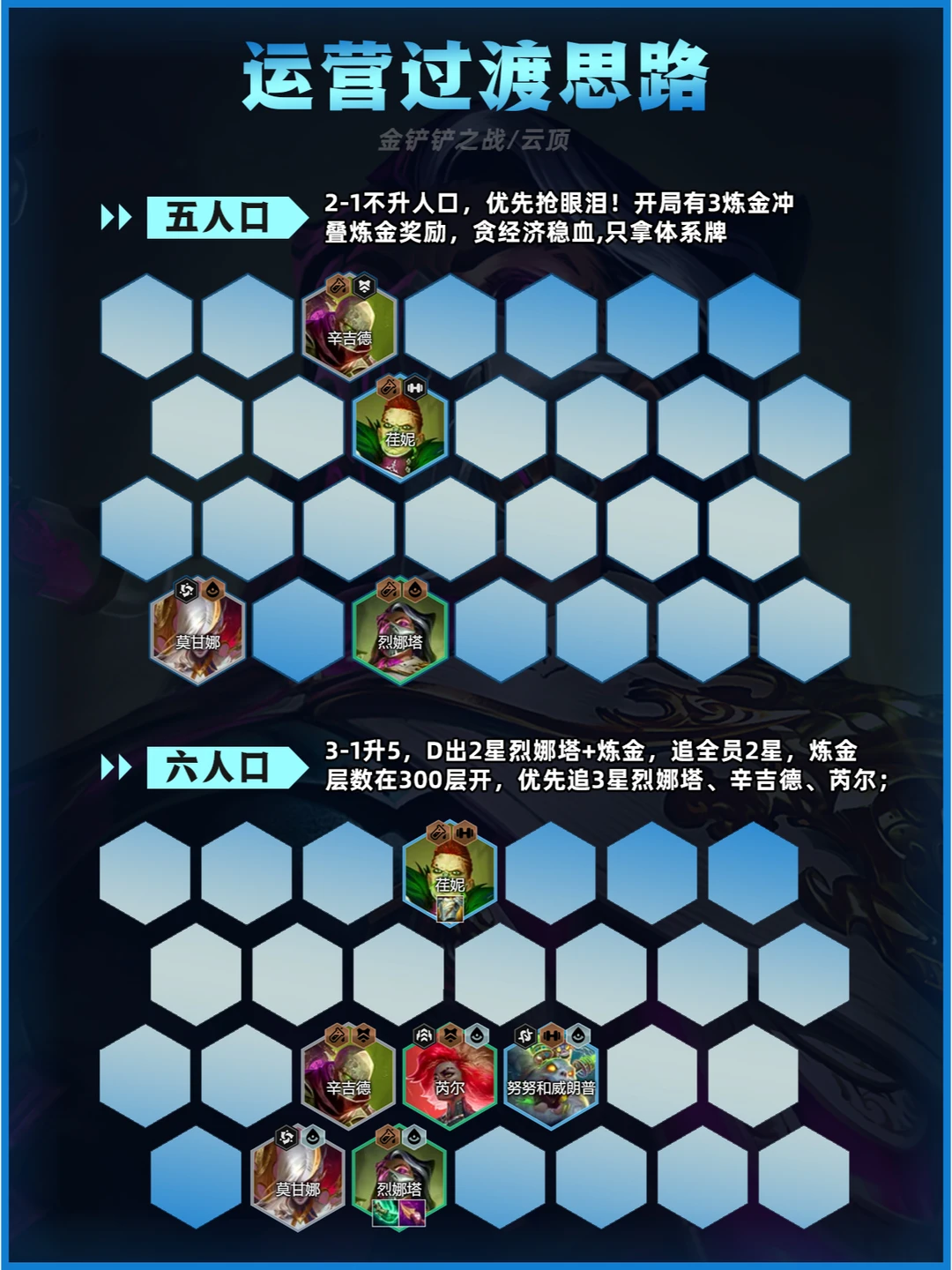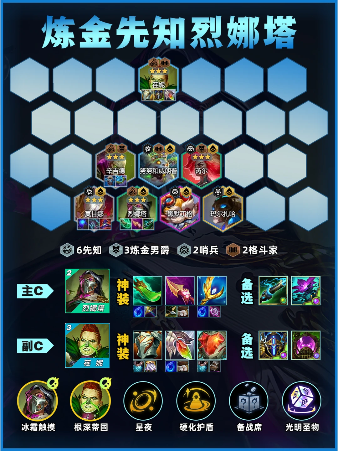 站位关键:前排吃护盾,炼金对位敌方主C,烈娜塔缩角防刺客!