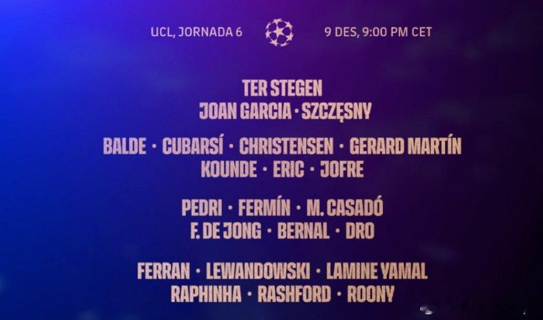 巴塞罗那欧冠主场对阵法兰克福的球员名单已经公布,伤愈的特尔施特根重新回到名单,阿劳霍、奥尔莫缺席。门将:特尔施特根、霍安·加西亚 、什琴斯尼后卫:巴尔德、库巴西、克里斯滕森、杰拉德·马丁、孔德、埃里克·加西亚、托伦茨中场:佩德里、费尔明、卡萨多、德容、伯纳尔、德罗前锋:费兰·托雷斯、莱万多夫斯基、亚马尔、拉菲尼亚、拉什福德、巴德吉