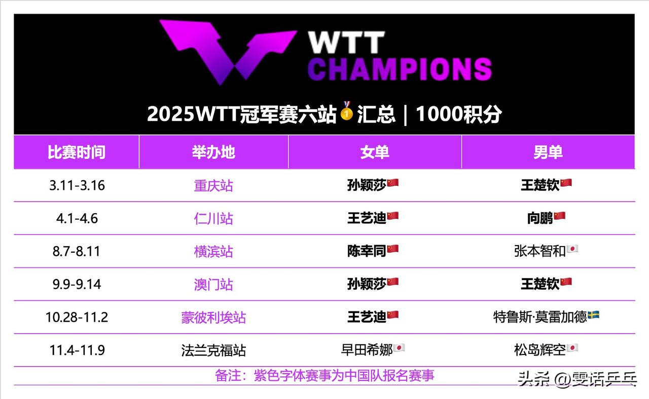 2025WTT球星挑战赛六站赛果汇总🔚 🥇🇯🇵X14、🇰🇷X6、🇨