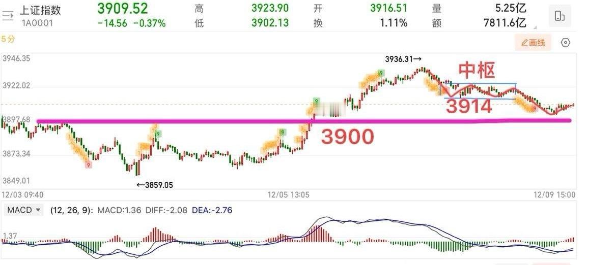 2025.12.9周二收评: 均线得失定方向,20日线方向未改,震荡或反复。 大盘观点:指数没啥好说的,短线大概率震荡还会反复,20日线方向(还有2-3天)还会继续下压,对指数仍有压制作用,所以,短线走势主要观察能否维持小阴小阳结构,守住均线上方就是正常的回调,均线粘合以均线得失定方向即可。 5分钟走势,如图,昨天收评标题就说过短线支撑看3900点,今天最低点刚好打到3902,接下来的走势,如果能够拉回到3914上方小中枢,那么还可以再去挑战新高,若不能则还会继续震荡走弱,从均线的思路,就是沿着20日线向下看,但是这里只要不出现那种急跌就没事,保持小阴小阳结构,就都可以接受,当作是盘整等待20日线拐头。 策略上,大级别还是中枢震荡,不追涨是原则,阴线买阳线卖,适当控制仓位。 个人观点,仅供参考!