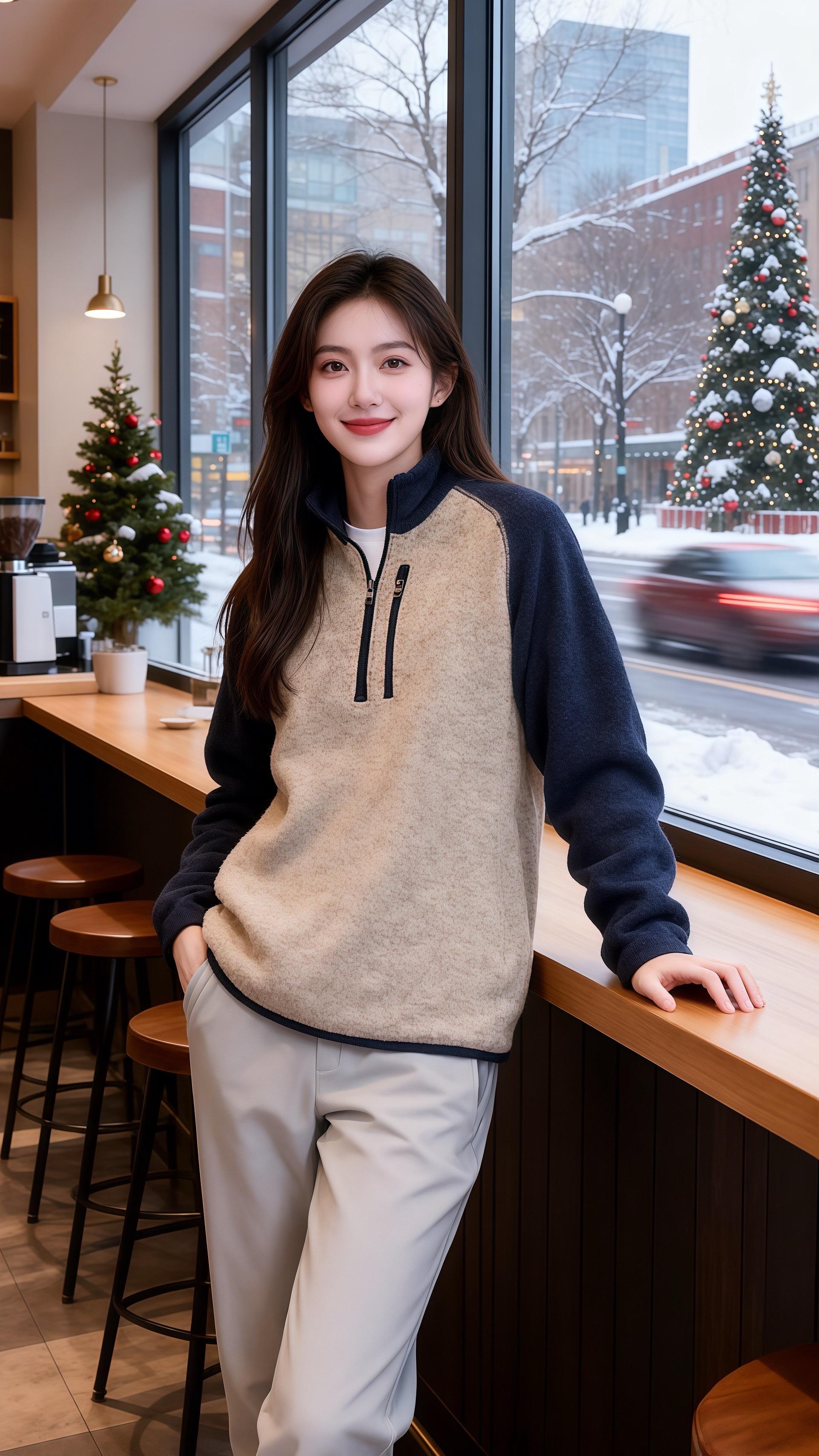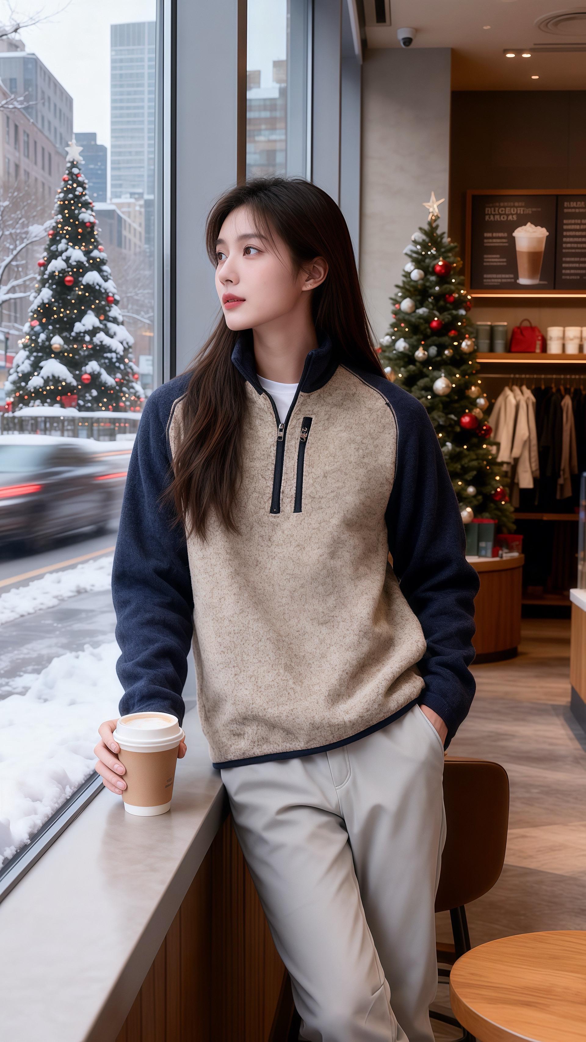她指尖点着模特的同款项,衣料随着抬臂轻贴小臂,半开的拉链漏出细白内搭,连咖啡杯抵在衣摆的弧度都温软。等她靠在吧台边,抓绒的绒面裹着暖光,窗外的圣诞树都成了模糊的背景。