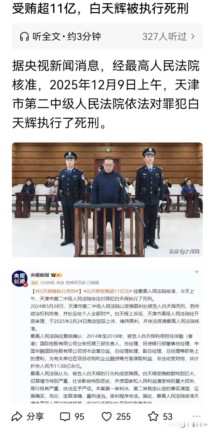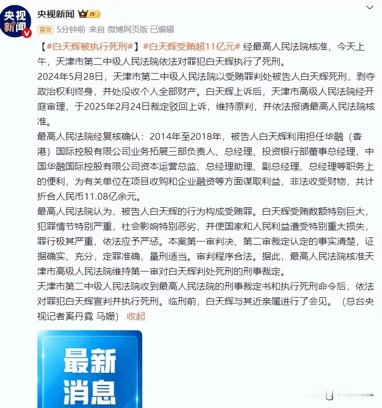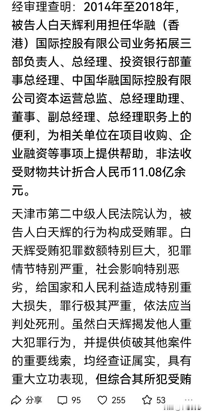 怎样的受贿“数额特别巨大”,会换来一粒花生米,而不是始终的“死缓”! 大家看那些贪官“台上一套,台下一套”,被查后,很多贪官的受贿数额都是“特别巨大”,判决结果出来,却基本都是“死缓”。 只是不知道他们后续能否改无期徒刑,再减刑到20年了。而且,再怎么说,他们也是拿到了长期牢饭,浪费国家粮食! 终于,今天才出来一个死刑。白天辉仅仅用了4年时间(2014年至2018年),利用自己在华融内的职权,为相关单位在项目收购、企业融资等事项上提供帮助,非法收受财物共计折合人民币11.08亿余元。 11.08亿元,王健林口里的“小目标” ,他用了4年就做到了,还是11个。 白天辉的受贿行为,受贿犯罪数额特别巨大,犯罪情节特别严重,社会影响特别恶劣,给国家和人民利益造成特别重大损失,罪行极其严重,依法应当判处死刑。 终于看到一个获得死刑的受贿分子了。上一个好像还是赖小明,受贿17.88亿元,也被判死刑。 或许,10亿以上是死刑的标准了。至于其他几个小目标的,都只看到死缓。 书慰我心