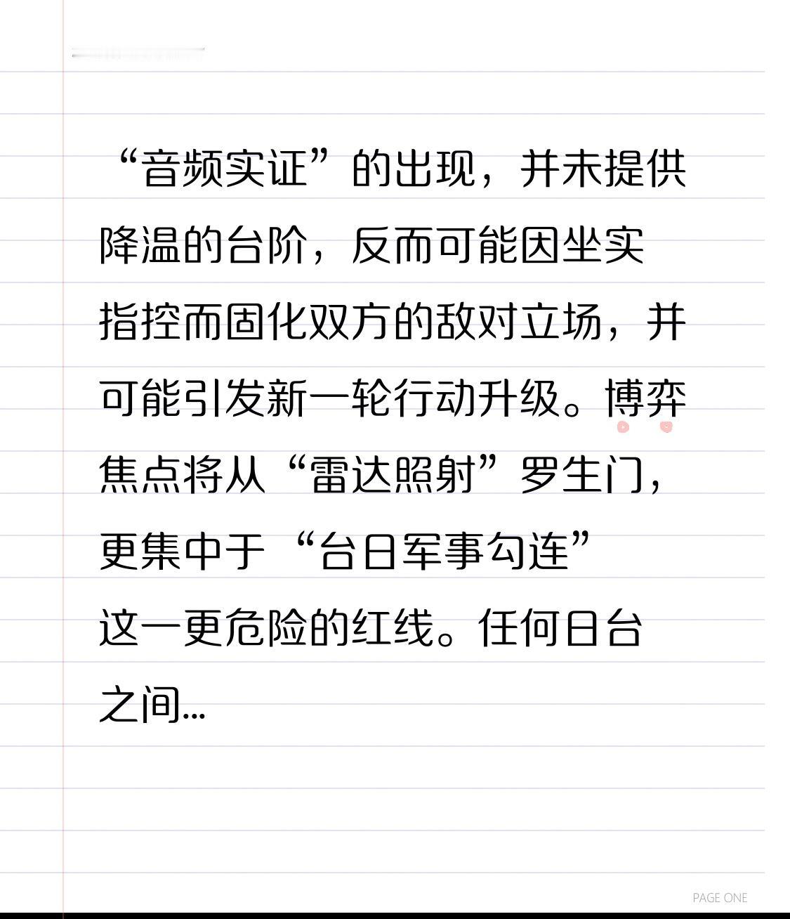 “音频实证”的出现,并未提供降温的台阶,反而可能因坐实指控而固化双方的敌对立场,并可能引发新一轮行动升级。博弈焦点将从“雷达照射”罗生门,更集中于 “台日军事勾连”这一更危险的红线。任何日台之间的实质性安全合作进展,都将成为引爆局势的最大潜在雷点。