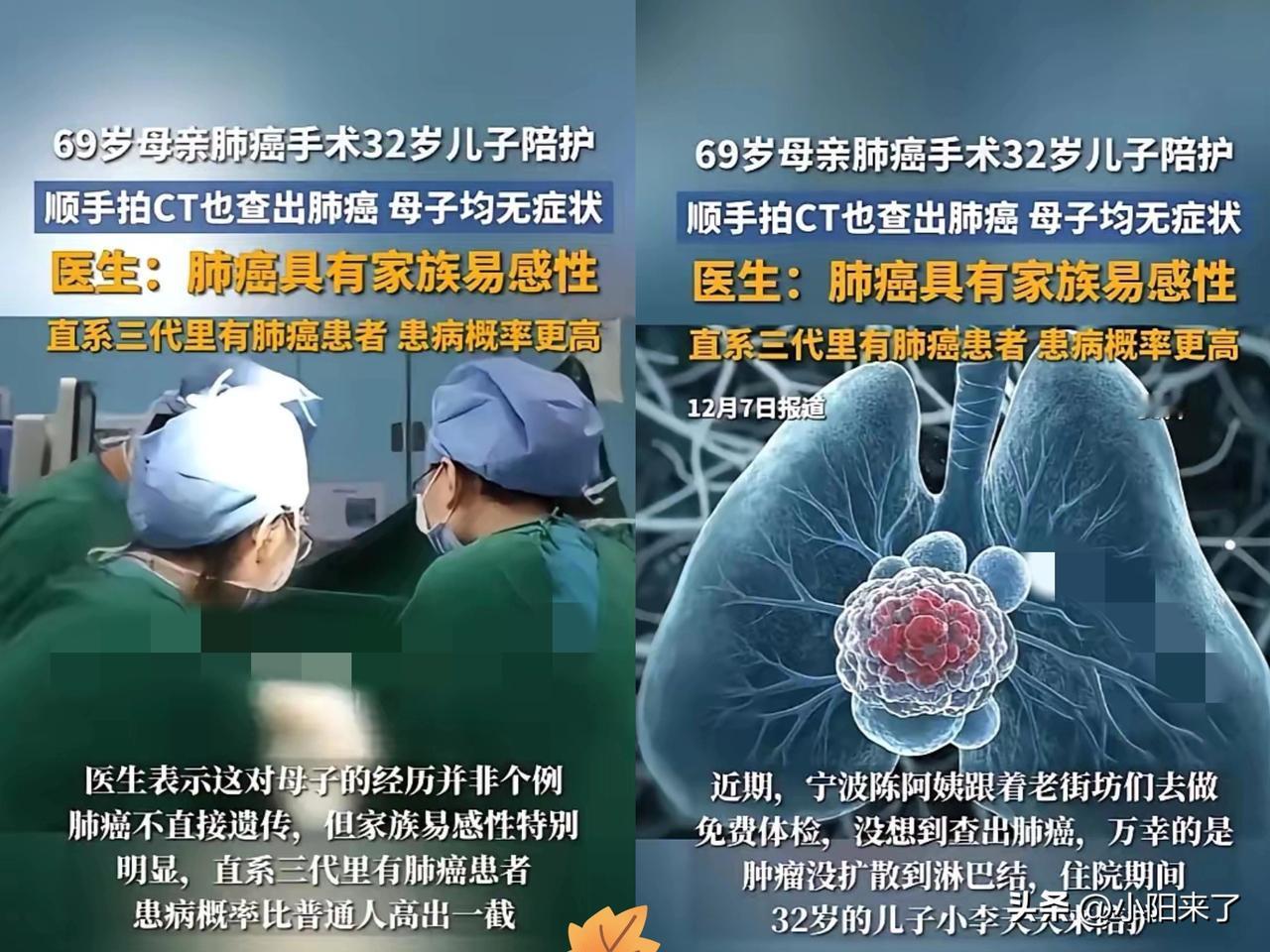 “太可怕了!”浙江宁波,一老人去体检,没想到竟查出肺癌,住院治疗后,32岁的儿子天天在医院陪护,顺便也做了个体检,发现竟然和母亲一样患了肺癌,令人疑惑的是,母子二人之前均没有不适症状 千万别再觉得“没症状就是没病”!肺癌从不是突然降临的,直系亲属患病,家人患病风险直接飙升2-3倍! 再加上一家人天天共处的厨房油烟、隐形二手烟,还有相似的饮食作息,这些看似平常的细节,早已悄悄把健康风险拉满! 更坑人的是,早期肺癌根本“悄无声息”,等出现咳嗽、咳血时,往往已经错过最佳治疗期! 这对母子能捡回一条命,全靠两个关键:一是老人没放弃免费体检,二是儿子“顺便”做了CT筛查! 低剂量螺旋CT真的是救命神器,辐射小还精准,哪怕是几毫米的微小结节都能揪出来,尤其对有家族病史的人来说,定期做它比啥都管用! 别再抱着侥幸心理拖体检了,家人的健康信号,就是你的保命提醒!