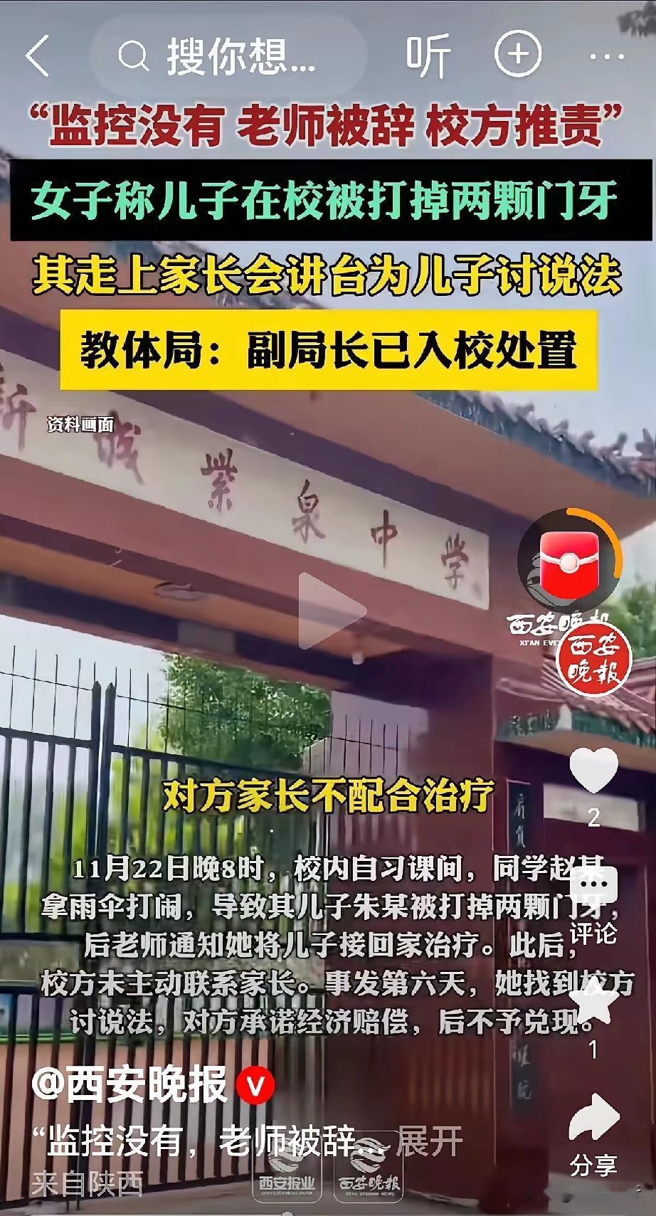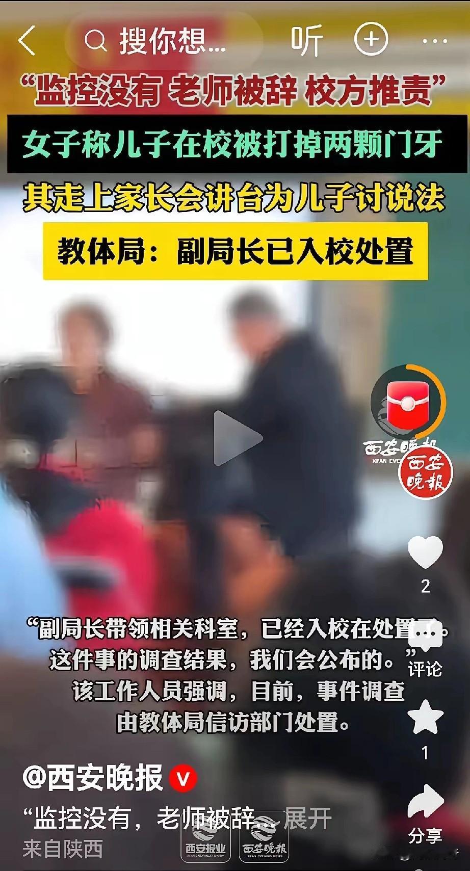 刚刚刷到一位妈妈冲上讲台为被打断两颗门牙孩子讨说法视频,太令人气愤了,但凡有一点办法谁会这么闹。 视频里这位妈妈全程情绪稳定逻辑清晰,已经很理智了,没说一句脏话。没有大吵大闹,没有撒泼打滚,一直在陈述事实和事件过程。 反倒是旁边两个老师,一直打断家长发声,还在那对家长拉拉扯扯的。最后,把家长拉走,到了办公室,又耍无赖,不给受害者家长说法,不管不问,还在那玩手机。 孩子在学校受了伤,作为学校,不能事不关己,学校本应是保护伞,保护好孩子的权益。 我就想问问大家,遇到这种事,家长还能有啥更好的办法?