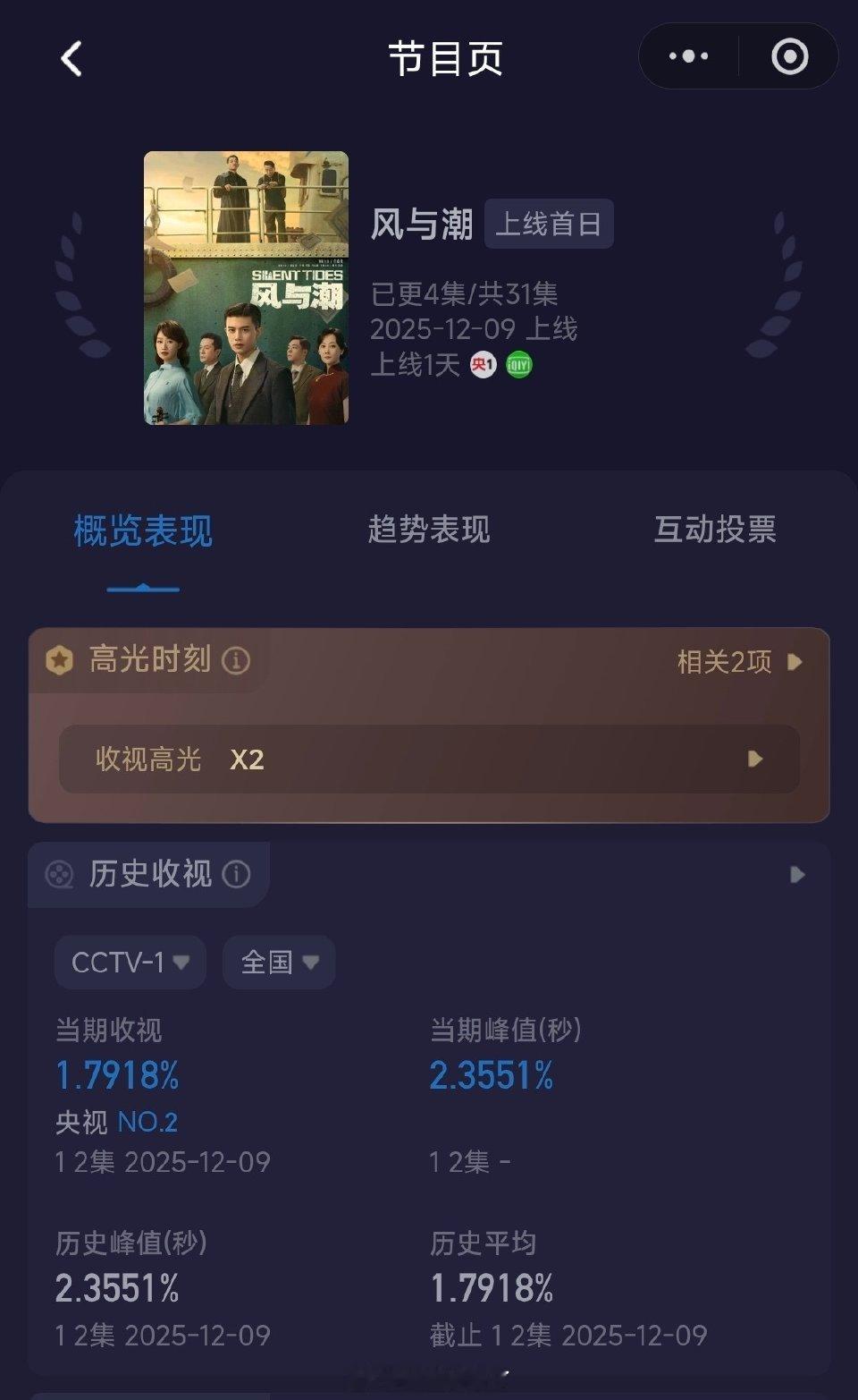 风与潮站内热度6014!4小时破6000!收视率是央1下半年首播第一!何贤角色热