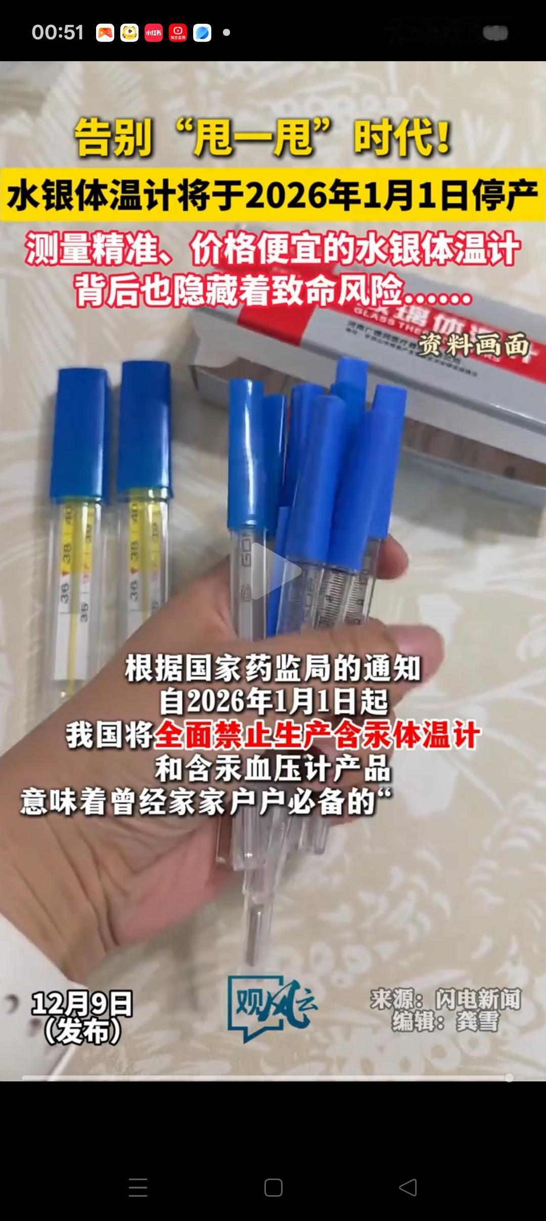 一觉醒来, 所有家里有水银体温计的都笑了[捂脸]! 没想到,现在水银体温计也成了抢手货,居然还买不到了! 原来从2026年1月1号开始,所有的水银体温计都不能销售了,所以大家都在存货,以至于都买不到了。 大家都觉得水银体温计不仅仅测试的效果好,很精准,价格还便宜,只要几块钱一只。 而新的体温计大概要20块钱,效果目前还不确定。 我也看了下,家里正好还有2只水银体温计,所以一点不慌! 那么大家这几天都囤了水银体温计吗?觉得有这个必要吗?不妨说说吧!