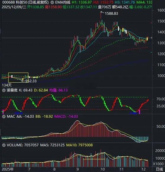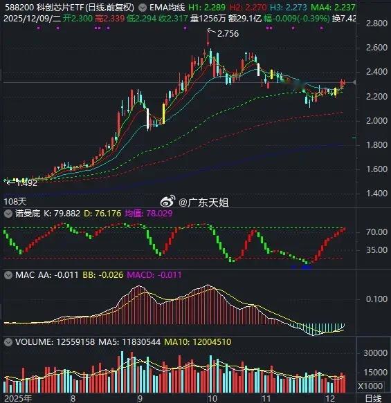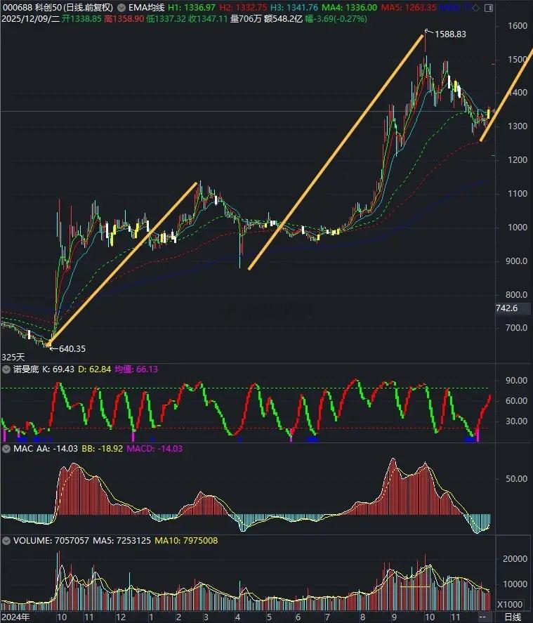 科创50要爆发第五浪上涨了?大盘今日低开后横盘震荡,午后小幅跳水,尾盘略有回升,最终报收小阴线。两市成交额1.9万亿,比昨日缩量1327亿。在前两日阳线面前,今日的小阴线只是小弟弟,对局势没啥影响。盘面上,热点依然停留在算力领域。不过,今日海外链与国产算力展开了对决,在工业富联、胜宏科技、中际旭创等达链个股上涨的同时,国产算力之寒武纪、东芯股份、摩尔线程也异军崛起,这主要来自于消息面的刺激。消息面上,美批准向中国出售英伟达H200人工智能芯片。按道理,在该消息的刺激下,今日达链的CPO应该狂飙、国产替代狂泄才对。但是,国内也不是吃素的,上个月就窗口指导互联网大厂们建设数据中心时,优先购买国产芯片;公共云和国家资助的数据中心项目,禁用国外AI芯片。美国这次让英伟达对华售卖H200芯片,也是没安好心,因为华为的昇腾910C整体性能已经接近英伟达H100了,距离H200一步之遥。在这关键时刻对华售卖H200,本质上是倾销,是为了扼杀昇腾910C的技术突破。既然国产芯片该跌不跌,说明有资金往里面涌入,继续看好科创板与科创芯片。在7-9月份时,科创50是领涨者,走出了很流畅的第三浪。经过两个月的回调后,它如果再爆发行情,那就是第五浪了。科技股的第五浪走完了,填平了科技股里最后的估值洼地(AI应用),可能就该主板上的老登股表演了。此外,光伏之多晶硅方向的个股,在持续极端缩量后出现量价齐升,值得关注或加仓。