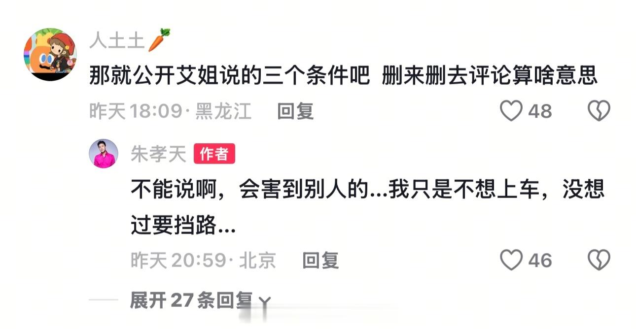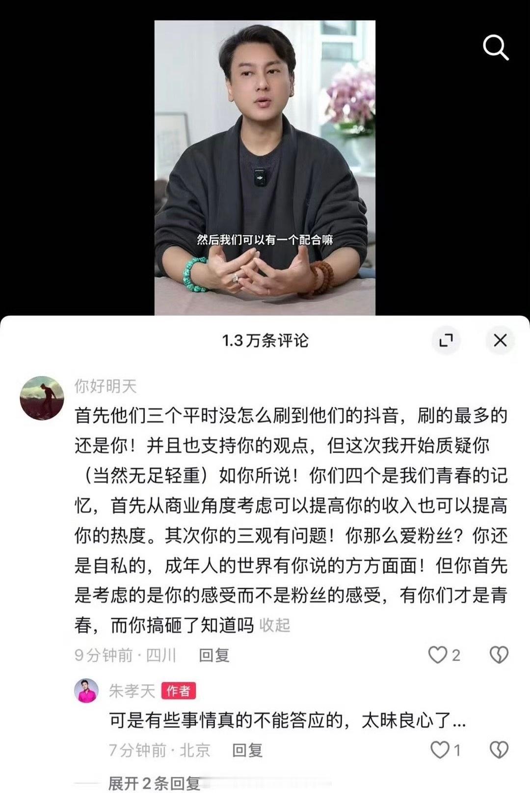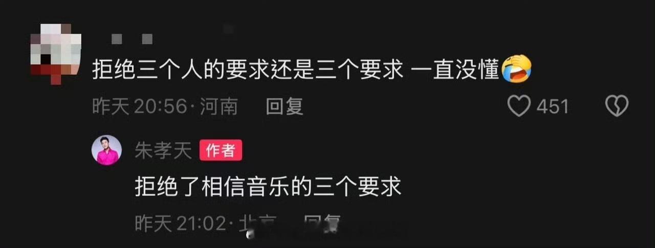 朱孝天再次回应自己为什么不参加演唱会,他说他拒绝了“相信音乐”三个要求,被踢了。而这三个要求是不能答应的,太昧良心了