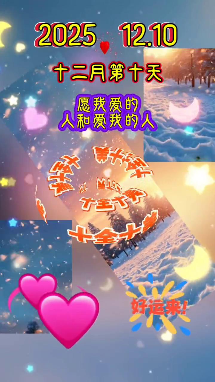 十二月第十天。 今天是十二月十日,星期三,农历十月二十一,也是十二月的第一个十全十美双福日。我向神明许愿,愿家人朋友在二零二五年的最后一个月事事顺心,好事连连,日子十分红火,生活十分幸福。愿我爱的人和爱我的人身体十分健康,工作十分顺心,爱情十分甜蜜,家庭十分美满。愿好运与你手牵手,平安与你常相随。早安,吉祥如意。