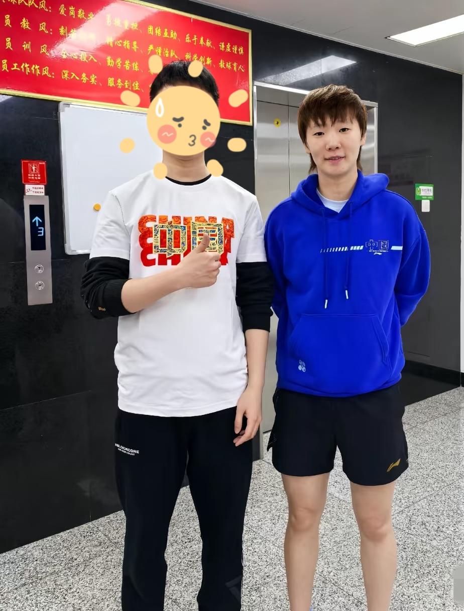 王曼昱与工作人员合影!王曼昱这腿真是又长又直又细又白!176cm以上的身高,天生当模特的料。结果闯荡乒乓球,闯出了名堂。 腿这么细,后天不知道付出多少努力增肌,才有今天能力。 现在看曼昱的大腿肌肉,孙奇体能教练负责后,真的有效增肌,整个人也明显壮实了太多!