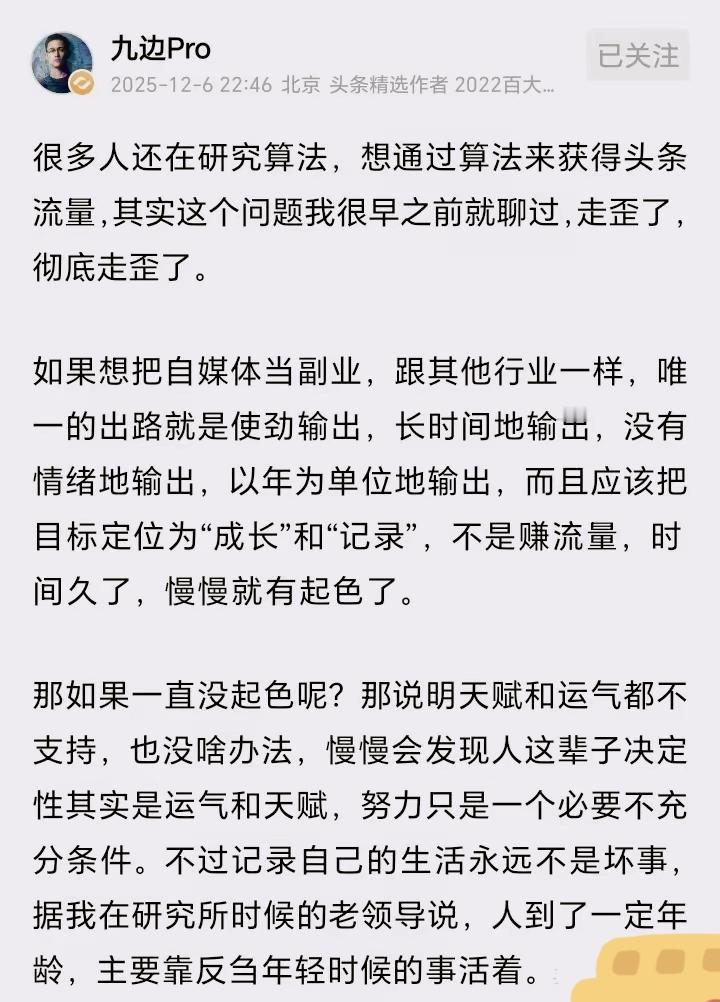 九边所说做自媒体的方法有一定的道理。但是只能听一半。我们是靠反刍自己的事活着。我们的输出的得有反馈这样才能不走弯路 “使劲输出,长时间输出,没有情绪的输出,以年为单位的输出” 你去看看那些一天发25条的没有任何情绪的输出有没有效果?我刷到过一个发了500多条,粉丝125个,那种账号真是废的可以!这个平台最的地方就是AI判定,互动多它就判定为优秀!那么这样会导致一个极其严重的问题,那就是: 你跟九边同时同量别输出,你觉得他会赢还是你会赢?所以那些成功人士的话你听一半就可以了,这个赛道先到者得,后到者吃灰。尤其是这个如💩的平台。 写作写作,世事洞明皆学问,人情练达即文章,处世圆通慎言语。