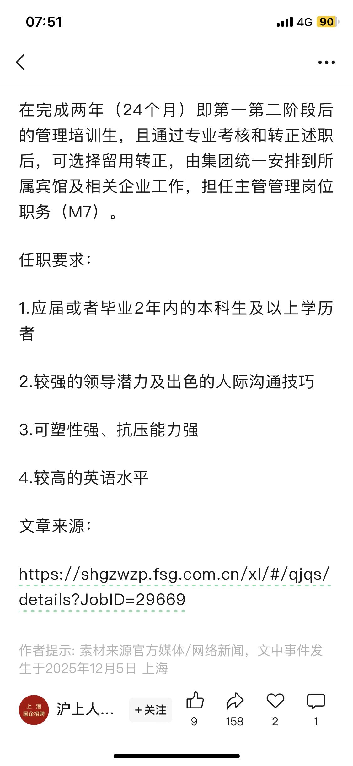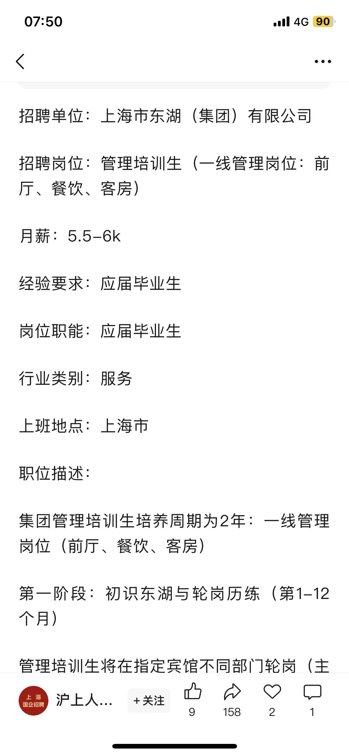 上海国企招聘本科毕业生,5000-6000月薪,要求有领导力英语好,今后应该有机会做服务领班。按说这待遇在上海仅仅温饱,租1000的公寓,吃饭一天按40算,一个月1200,再扣除交通、手机费200,扣除社保,社保基数上海市按照7000多计算,剩下的钱,水费电费,这样的收入,指望年轻人去恋爱去生育,是不容易的。