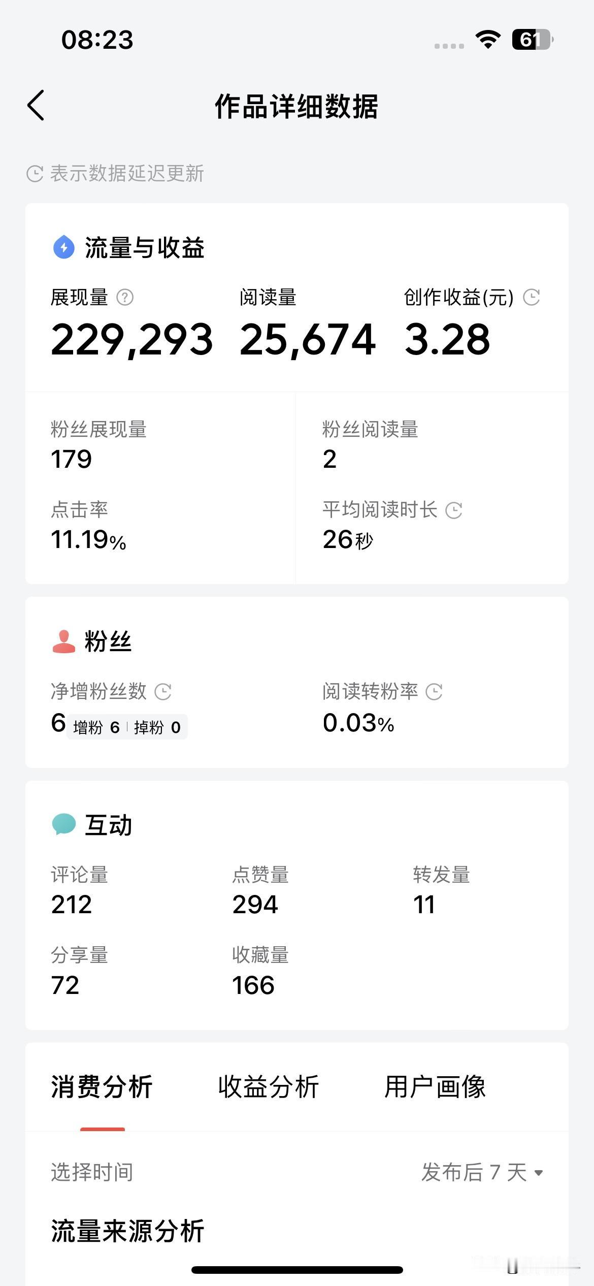 看着我这收益惊讶吧! 展现量229293,阅读量25674,评论量212点赞量294,收藏量166,分享量72,转发量11,看看这收益才3.28元,看着多么的伤心啊! 听条友们说,评论量和点赞量多,收益都非常可观的,可是我就没有啊?难道头条另眼看待? 这样的头条还有必要坚持吗?