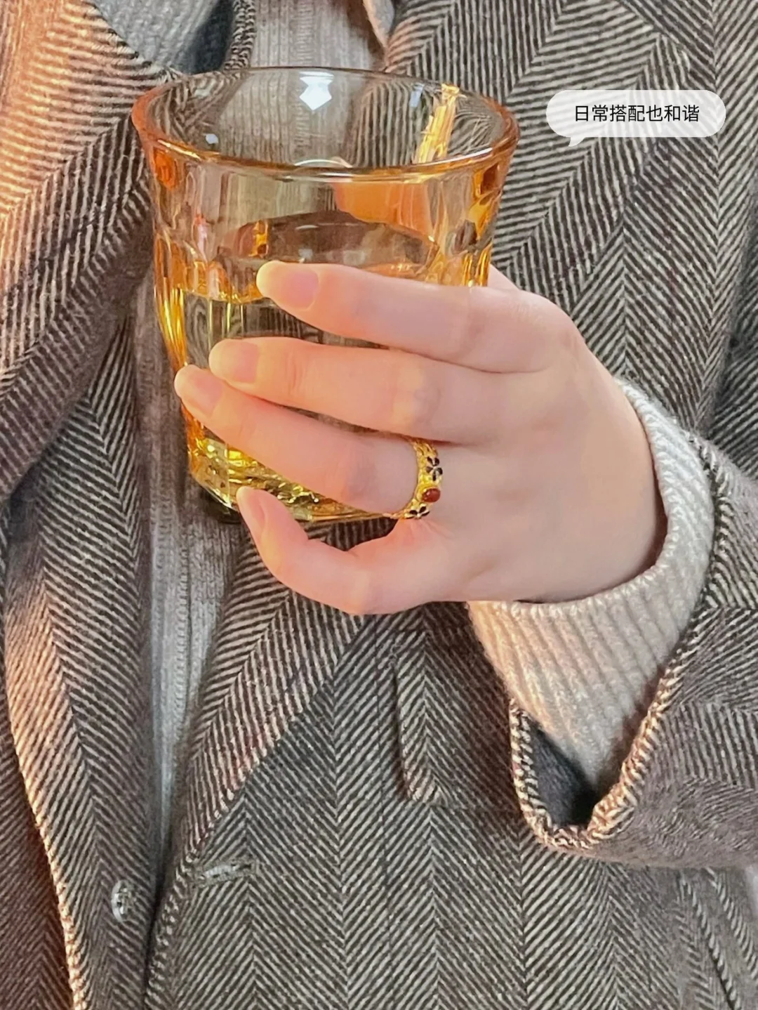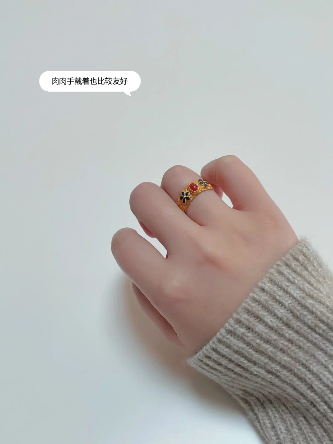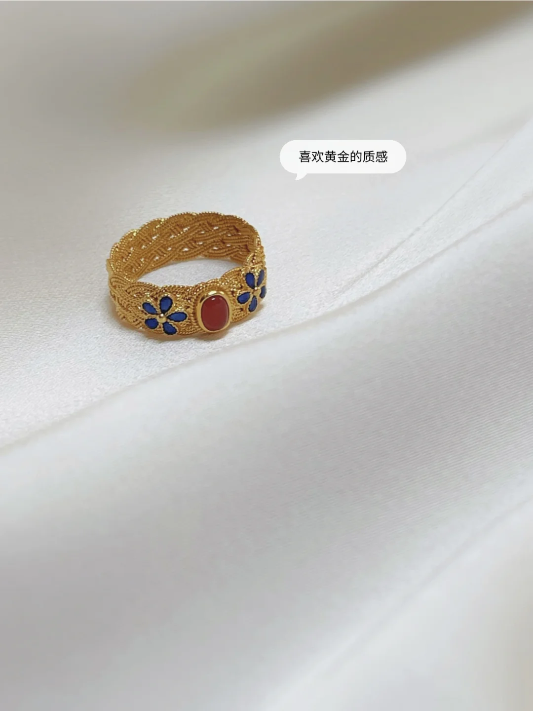 黄金部分是手工花丝编织,点缀了红玉髓和蓝色珐琅,整体精致复古又文雅。初见被外观吸引,后来发现玲珑版凤华对肉肉手也很友好,很显秀气,日常搭配也并不难。