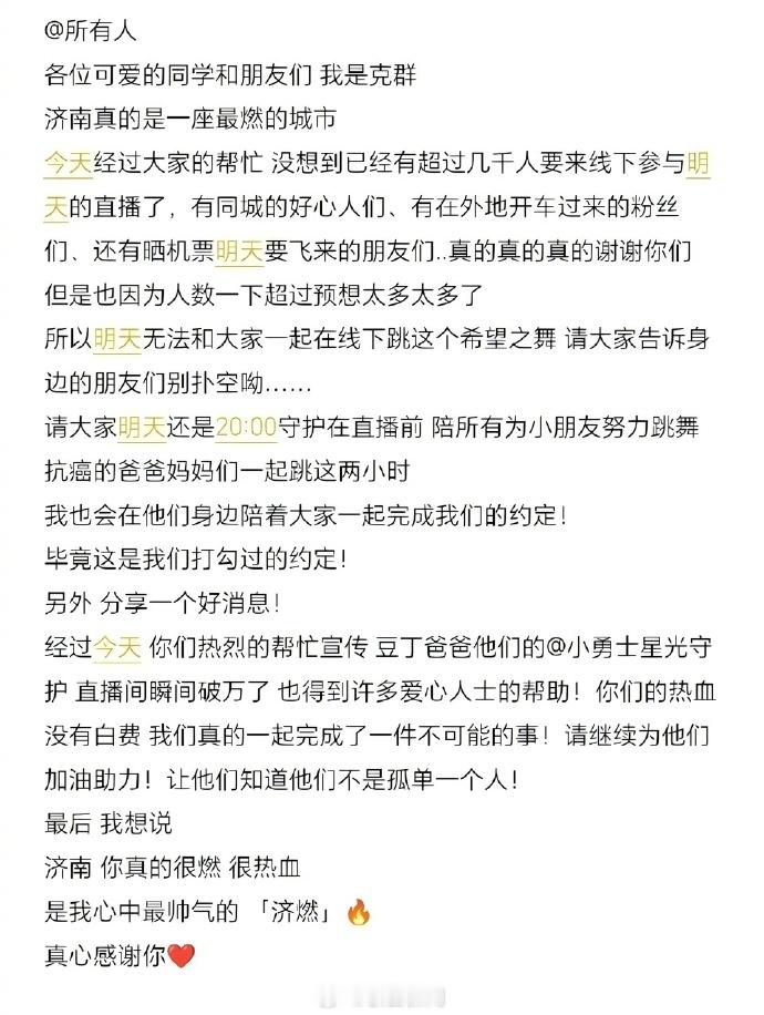【吴克群直播和患儿父母跳舞】吴克群回应和患儿父母连线跳舞12月8日,在山东济南,吴克群分享了一段视频,他关注到有一群家长每天在寒风中跳舞,他在视频中解释这些家长们不是专业表演者,而是患罕见病儿童的父母,每一次重复的动作里,都是为孩子争取治疗机会,这些家长想通过直播跳舞的方式,请更多网友关注他们,以此来筹集医药费,他们从晚上七八点跳到凌晨一点,全力以赴地重复跳着“希望之舞”。吴克群在视频最后提出要学习这支“希望之舞”,号召更多人一起加入这个团播,完成这件不可能的事。之后,吴克群工作室发文称,经过大家的帮忙,已经有超过几千人要来线下参与明天的直播了,有同城的好心人们,有在外地开车过来的粉丝们,还有晒机票明天要飞来的朋友们……真的谢谢你们,但是也因为人数一下超过预想太多了,所以明天无法和大家一起在线下跳这个“希望之舞”,请大家告诉身边的朋友们别扑空,也请大家明天还是20:00守护在直播前,陪所有为小朋友努力跳舞抗癌的爸爸妈妈们一起跳这两小时,我也会在他们身边,陪着大家一起完成我们的约定!毕竟这是我们打勾过的约定。12月9日,晚上8点25分许,吴克群如约和这些家长进行短视频直播连线,他表示因为报名参加此次活动人太多,并且场地有限,因此只能和各位家长在线上一起跳“希望之舞”,吴克群呼吁更多的人关注到这些患罕见病儿童的父母,为他们助力,让这些家长知道他们并不孤单。“我很开心能和你们一起跳舞,这支舞蹈我已经学了两天时间,现在我想陪着你们一起把这支舞跳好,给患病的孩子更多的希望。”吴克群对家长说道。之后,吴克群陪着这些家长一起跳起“希望之舞”,直播间观看人数很快达到4万余人。在晚上9点37分,直播快要结束的时候,吴克群再次对所有观看直播的网友表示了感谢,并称希望我们都能够守护好身边最珍贵的人。(极目新闻)