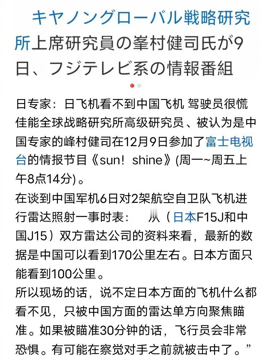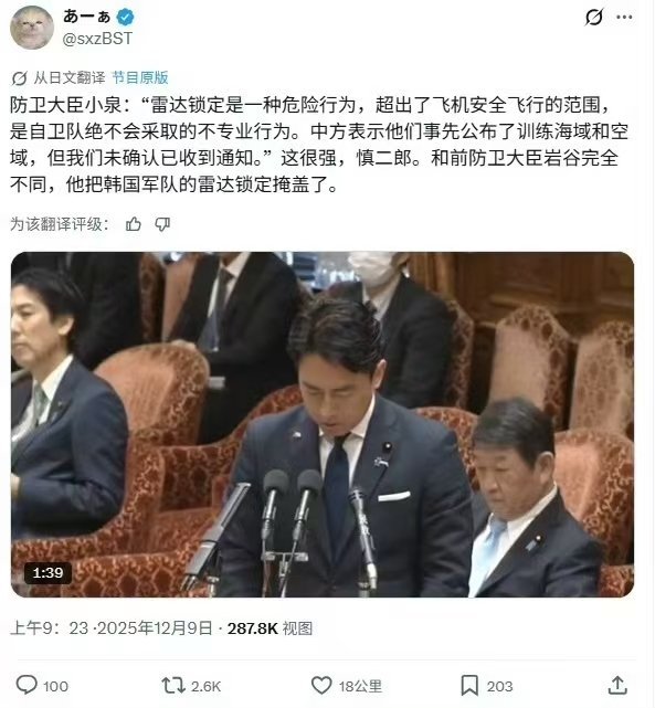 雷达锁定日机这事,暴露了日本三个大毛病第一个,内部沟通失误。中方公布通报了训练海域与时间,公布了证据,和日方有通话。小泉进次郎却说没有接到,显然日本内部有人渎职,说不定用传真机就当完成程序了。第二个,军机落后无法遮掩。被中国并不是最强的J15锁定30分钟,没法摆脱不说,还不知道对方在哪。日本懂点的已经知道找意味着什么。第三个,着急攻击表态,对自身实力地位没有认知。日本很多人还不知道落后到可怕的程度了,以为对抗能如何表现,或者拖美国下水,对高市早苗支持率很高,又菜又爱玩。不少人看到这种弱鸡首相乐坏了,日本人却不知道发生了什么事。