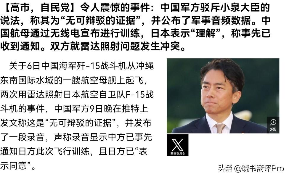 中国拿出铁证,小泉进次郎公开说谎,小泉进次郎被要求应立刻辞职下台!12月10日,根据日媒报道,日媒称,中日军事摩擦事件发生惊人逆转,中国军方驳斥小泉大臣的说法,并公布了军事音频数据。该证据显示,中国航母通过无线电宣布进行训练,随后来自日本的“日本军舰 116”回应道:“我已收到你的信息”。 而中方已事先通知日方进行此次飞行训练,且日方已“表示同意”。但是,日本防卫大臣小泉进次郎却在12月9日公开表示,我并未看到任何关于辽宁号航母及其他飞机训练海空区域的航行通告、航空信息或导航警告提前发布。很显然,我方拿出铁证以无可辩驳的事实证明,小泉进次郎就是在公开撒谎。 事实证明,我们的动作已经给日本打过招呼,所谓的雷达照射事件就是日本精心策划的谎言。而在相关消息传到日本国内之后。日本国内就有人站出来表示,既然中国已经公开了音频数据,日本政府就有说明责任。若是捏造,就必须拿出明确证据进行反驳;若是事实,那小泉的答辩便是虚假陈述,显然欺骗了国民——这不仅是小泉个人的问题,更是内阁应全体辞职的大事。 不客气的说,小泉进次郎这种公开说谎的行为性质非常的恶劣。如果在军事方面的问题,日本都可以公开说谎,煽动,日本政客真的什么事情都可能干出来。如果任凭日本政客添油加醋,倒打一耙,这事实上将严重冲击中日关系,或酿造新的事端。这样的政客的行为无疑极不负责。