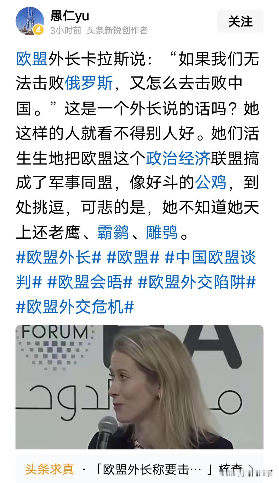 这位欧洲卡小姐要喝多少瓶伏特加才能说出这样的话?冯大妈不敢说的话她居然也敢说。 欧洲没救了,这不是我说的,是美国写在国家安全战略报告里的,警告欧洲面临“文明消亡”,并指责欧盟阻挠该进程。 欧洲享受了几十年的马歇尔计划,用了几十年廉价的俄油,又赚了东方大国发展带来的几十年红利,转眼间却都成了敌人。 满嘴胡言的卡小姐既然要拯救欧盟拯救欧洲,就要勇于承担艰难和责任。 你不下地狱,谁下地狱……